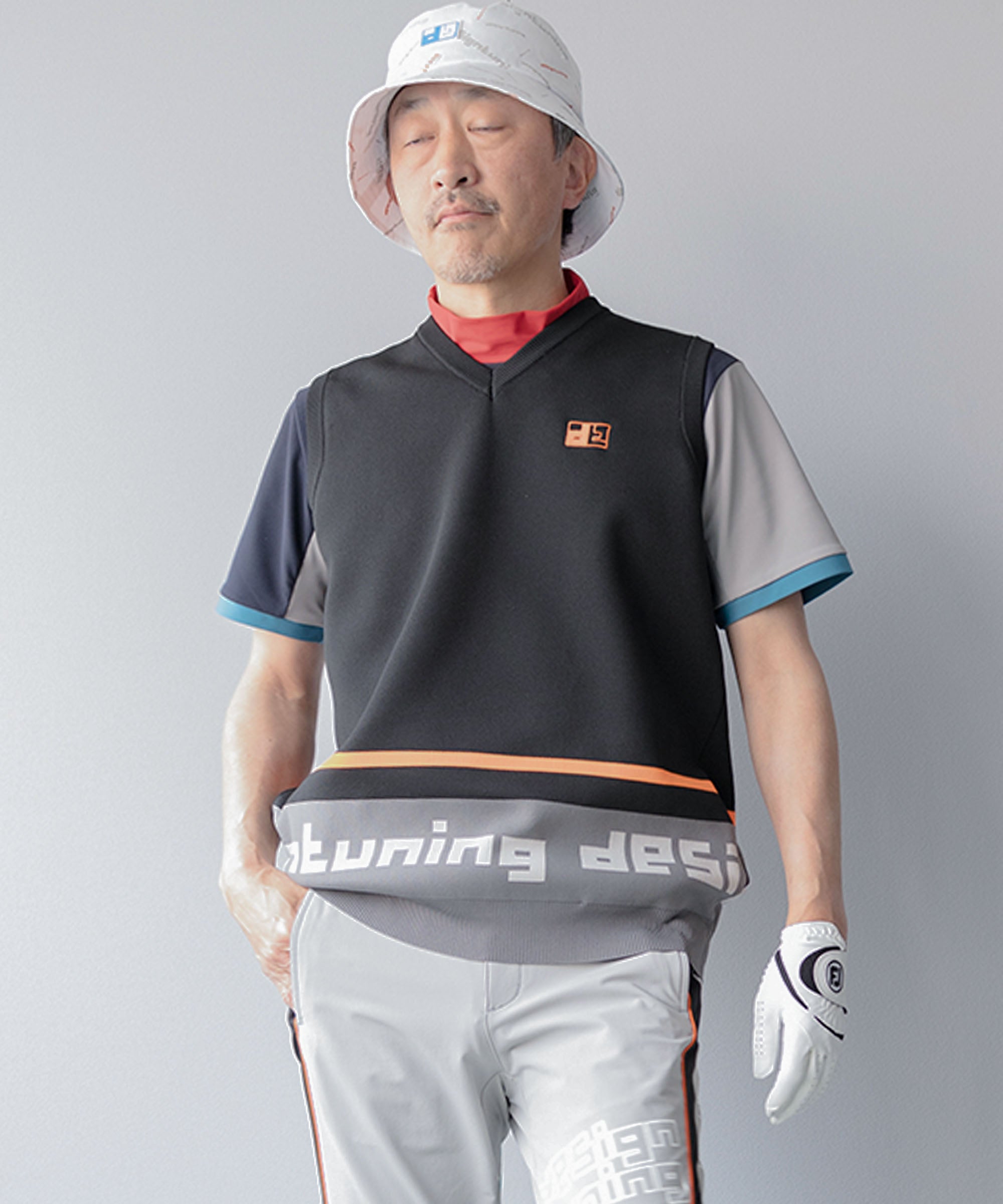 肌寒時間にモックネックの上から着用するだけでゴルフ場で映える配色のニットジャガードベスト。