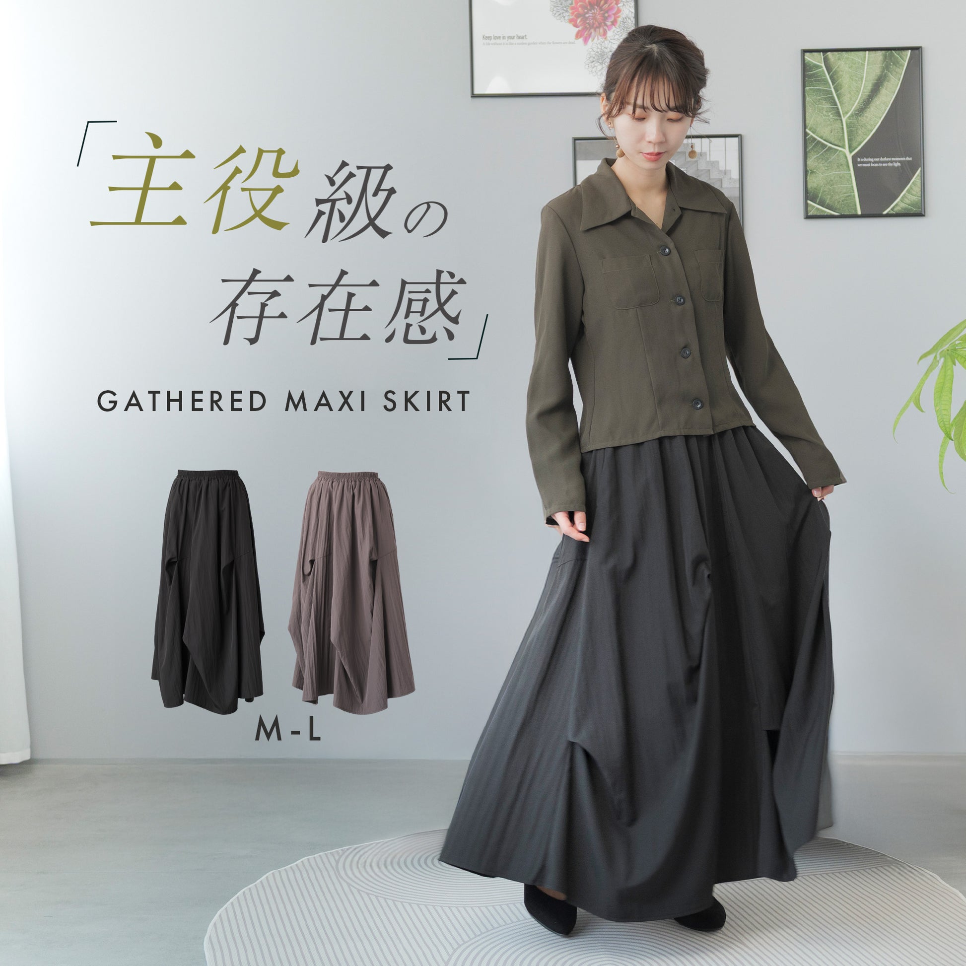 おしゃれな変形ギャザーマキシスカート、 個性的だけどコーディネートしやすいデザイン。