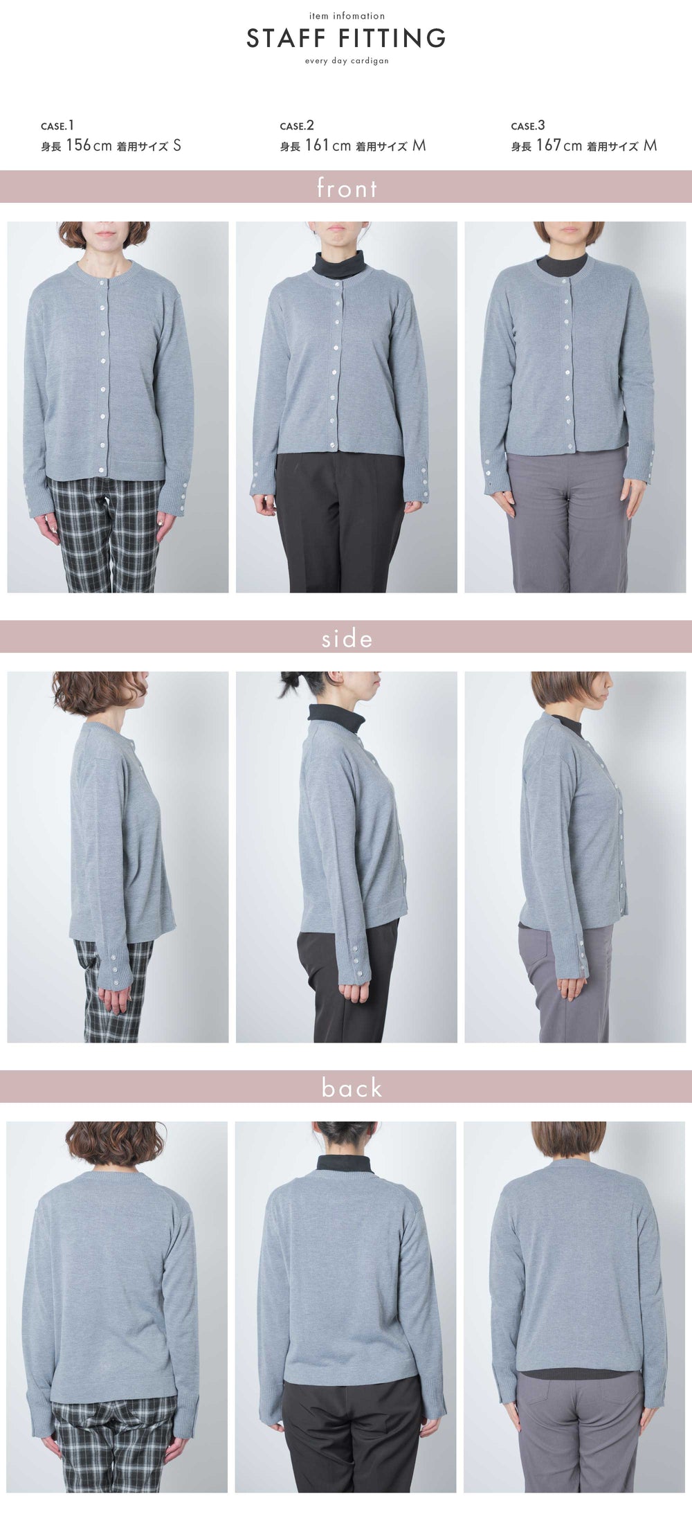春も夏も秋も冬も 「ちょうどいい」365日カーディガンシンプルなクルーネック長めのカフスに綺麗に並んだボタンどこか可愛さを感じるシルエット季節を問わず「ちょうどいい」が続く程よい厚みの素材感夏の冷房対策、冬の重ね着、春・秋のトップスとしても◎一枚でも、重ねても、主格にも脇役にもなれる万能トップス着用シーン:ビジネス オフィス カジュアル オフィスカジュアルモデル 163cm 着用サイズ S