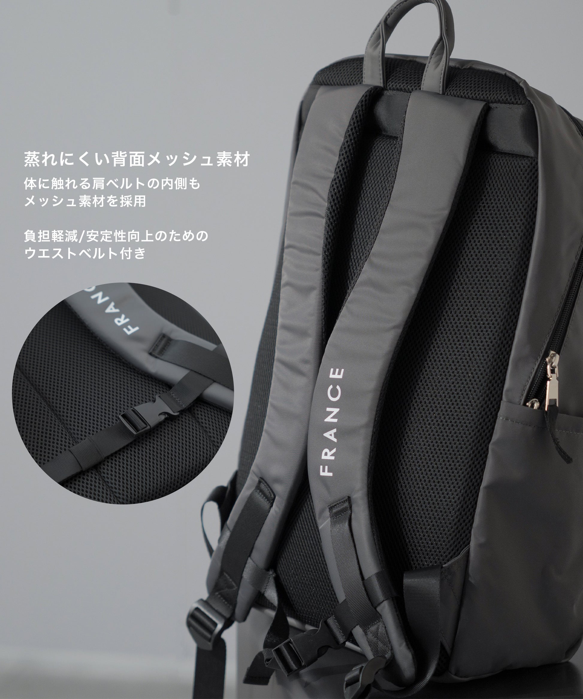 斜めに入ったメインファスナーがデザイン性と実用性を兼ねていて、取り出しやすい仕様メインルームにはパソコンやタブレットの持ち運びがしやすいクッション付きのポケット小物を入れる2つのポケットにファスナー付きポケット付き使いやすいファスナー付きポケットをバッグ全面に配置鍵やスマホなどさっと取り出したいものを入れられます背面と肩ベルトの内側は蒸れにくいメッシュ素材ウエストベルトもついているから長時間の使用も負担軽減してくれます