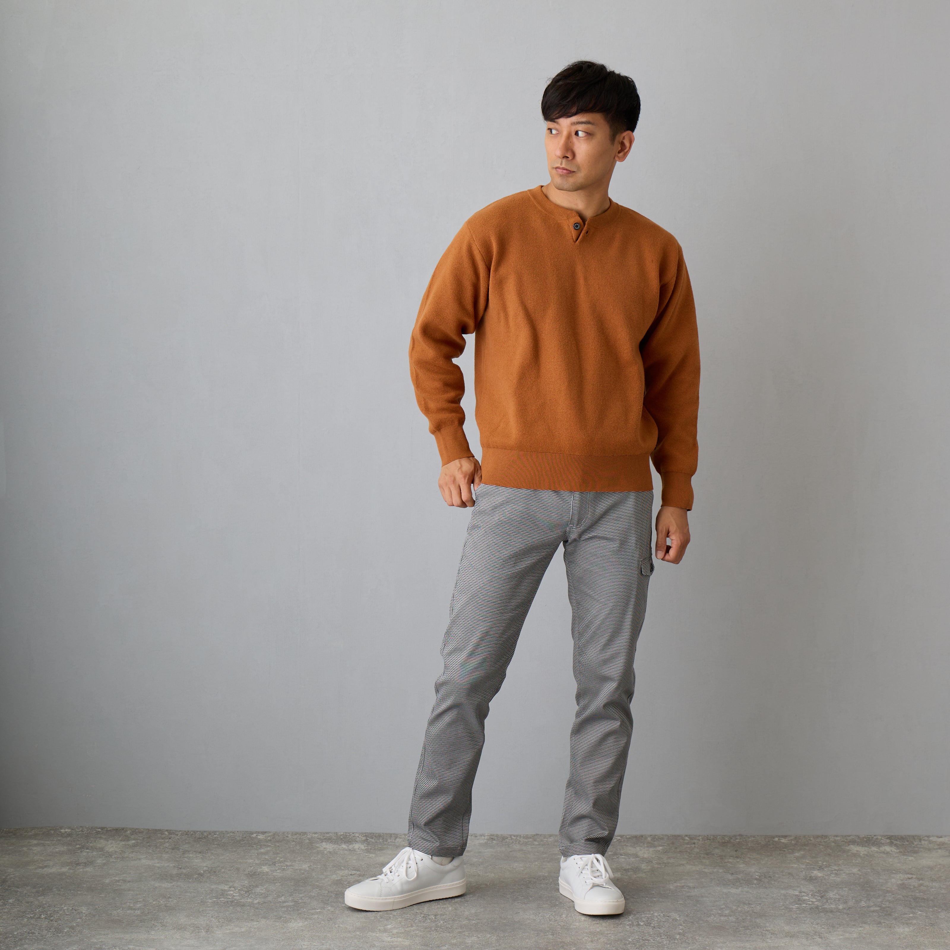 ベーシックなデザインのヘンリーネックセーター。