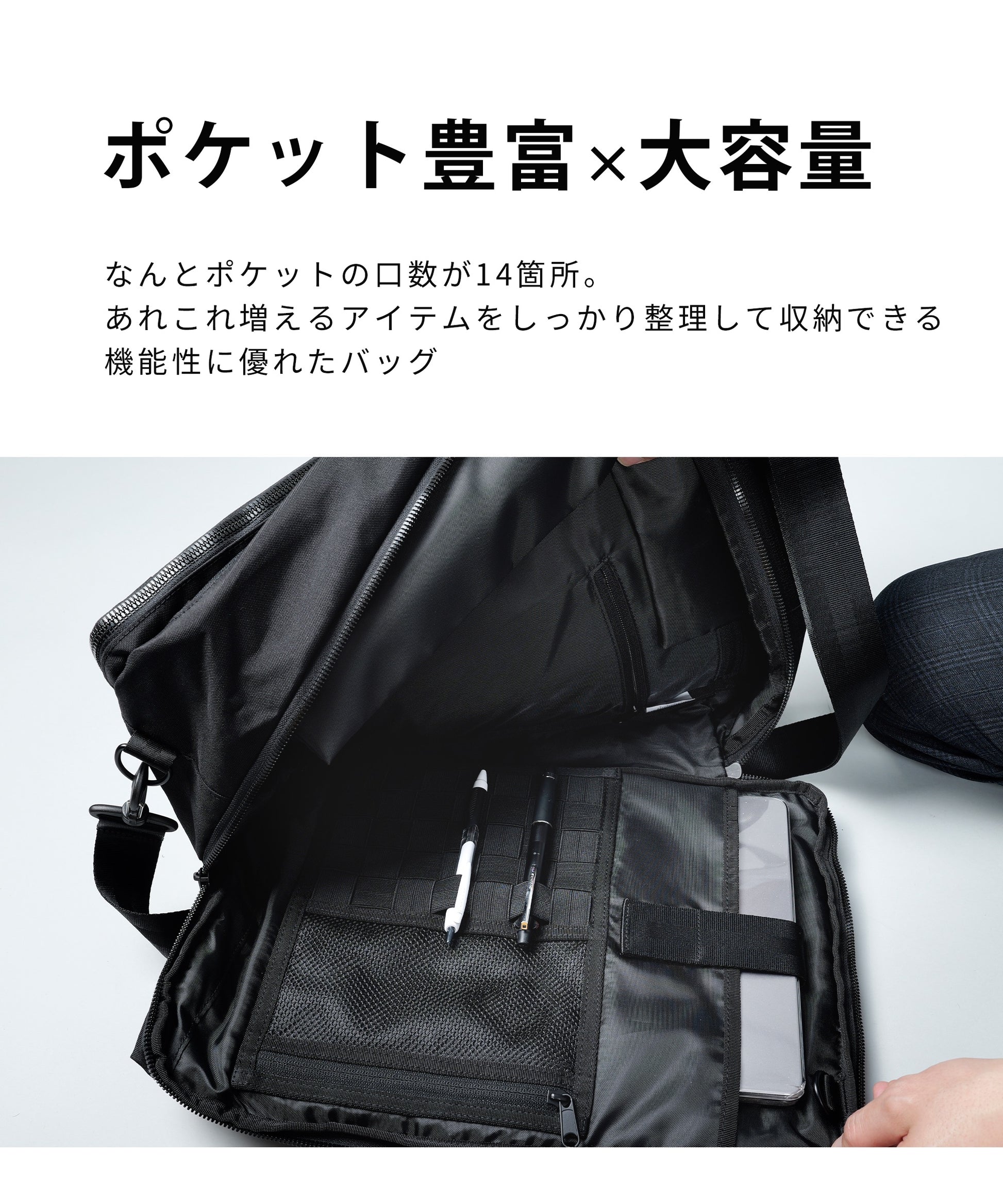 シンプルデザイン&多ポケット&頑丈!「あったらいいのに」の欲しい機能を全部詰め込んだ多機能リュック・手提げorショルダー掛けorリュック 持ち方3Way仕様。・ノートパソコンをしまえるスペースにはマジックテープで飛び出し防止。・イヤホンやメモリースティックなど小さいものをしまえる内側起毛素材のポケット付き。・水滴が中に染み込まないよう防水素材使用のポケットも装備。・収納がしやすいよう大きく広がるメインルーム。通勤・通学はもちろん、デイリーで使えるように、コーディネートを選ばないシンプルなデザインで、ジムバック、マザーズバックなど、いろんなシーンで使える活躍します。タフな素材「コーデュラー610Dポリエステル」一般的な基準値に比べ10倍以上の耐摩耗性(第三者機関調べ)擦れが起こりやすい環境でも安心のタフさ。財布や手帳に、ノートパソコンからタブレットまで。毎日使うものも楽々収納できる大容量!