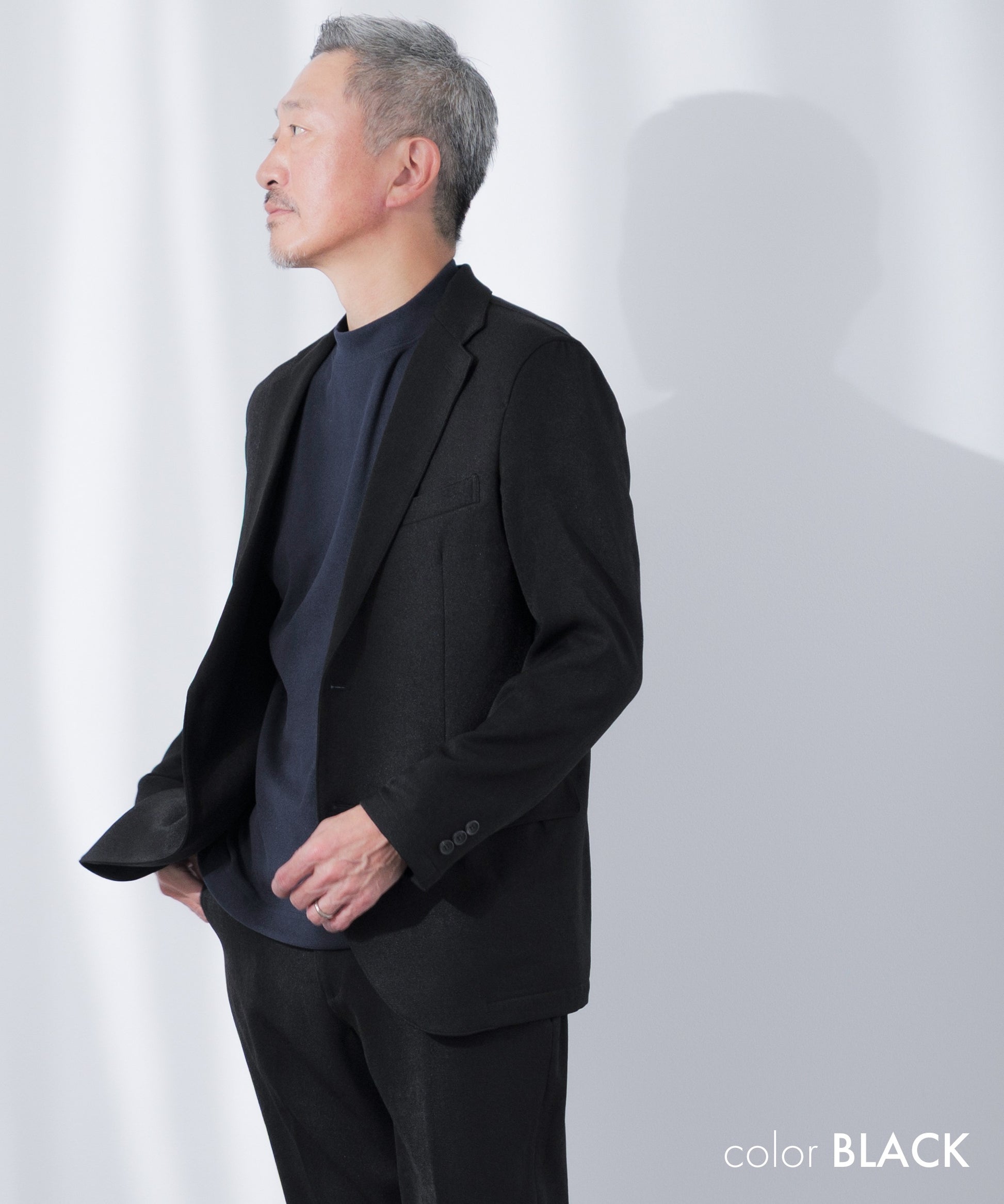 杢調のウーリーな見た目と柔らかな肌触りの素材が秋冬によく合う、サキソニーセットアップ。
