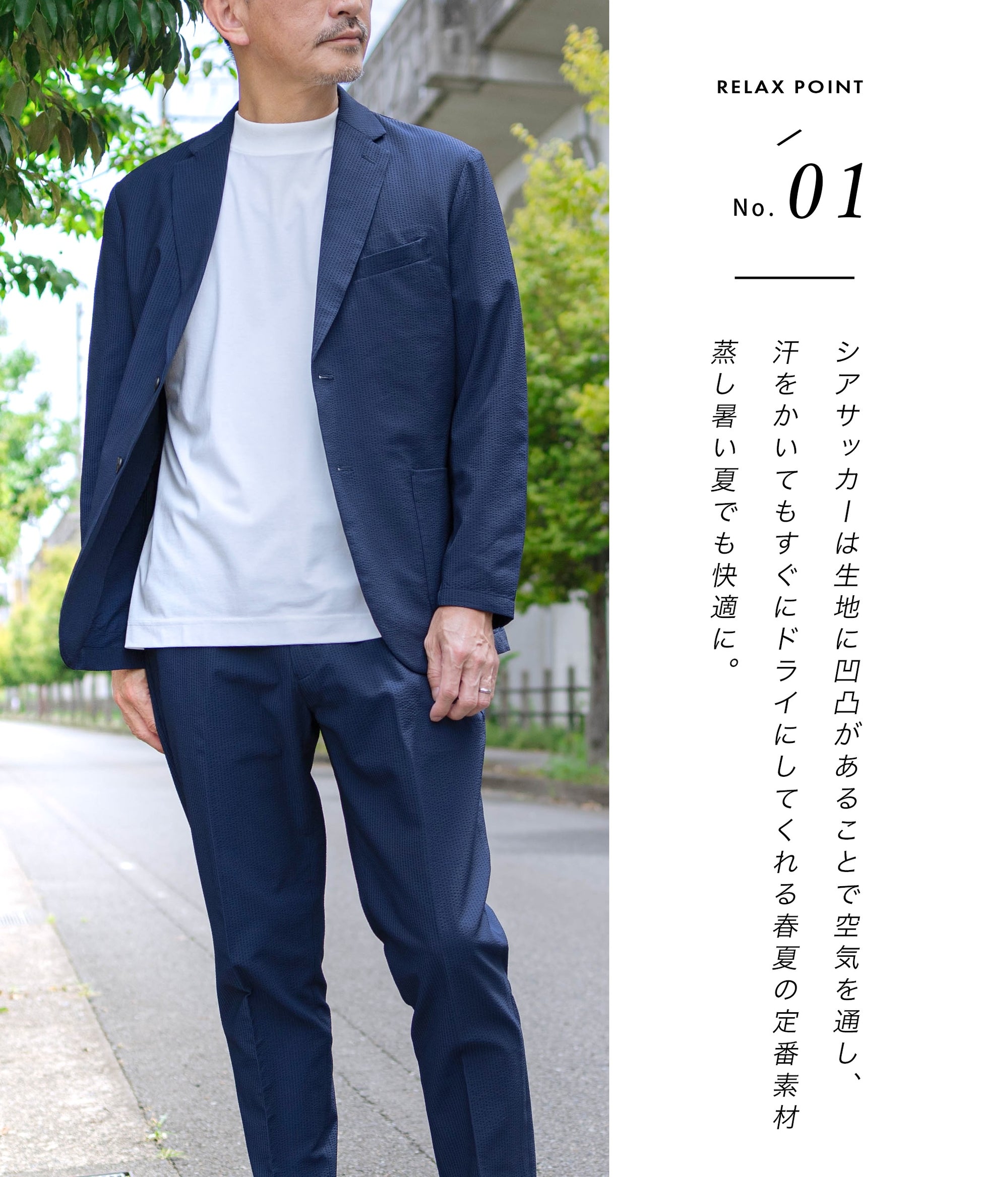 リラックス感ときちんと感が両立できるシアサッカーのセットアップ