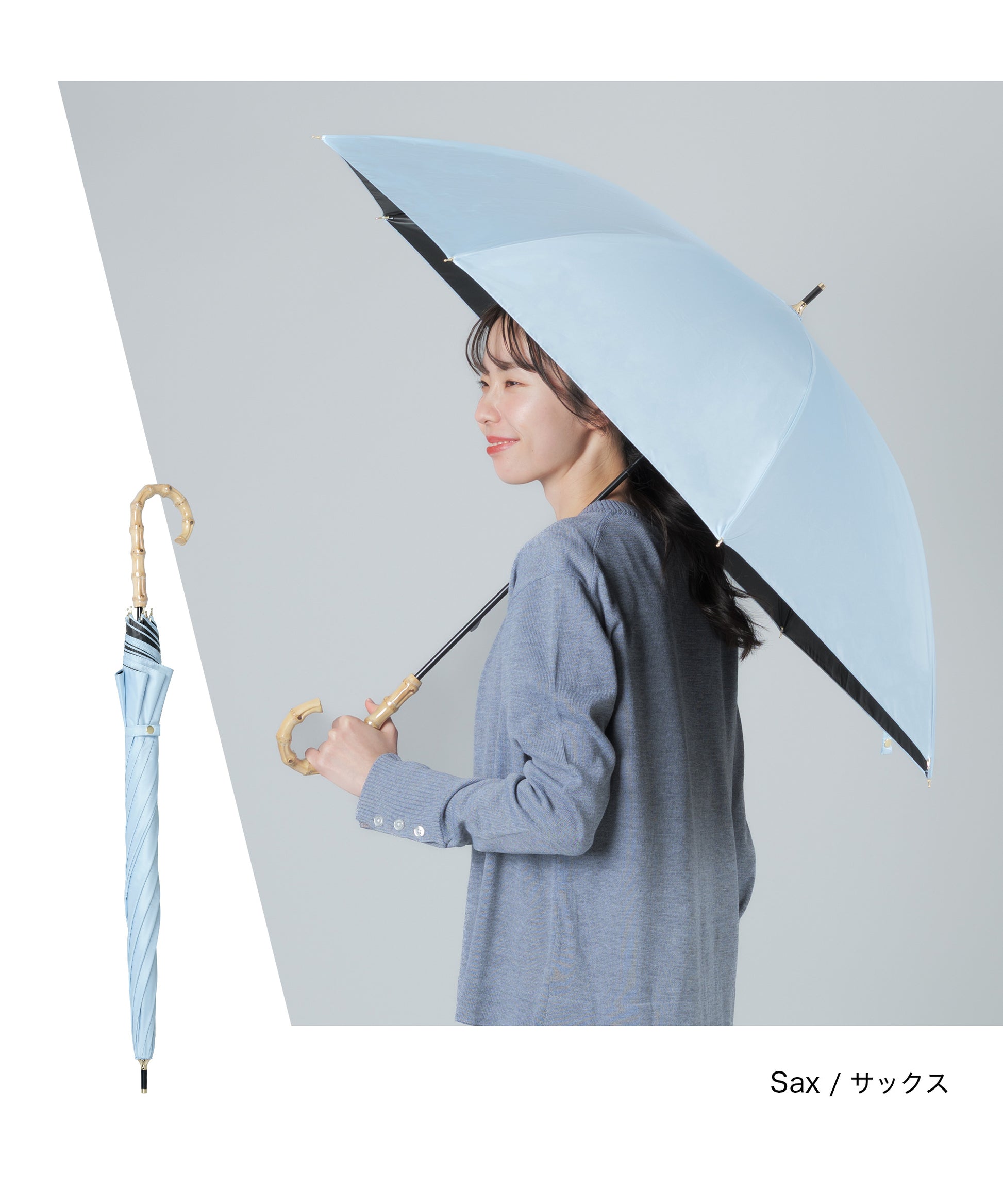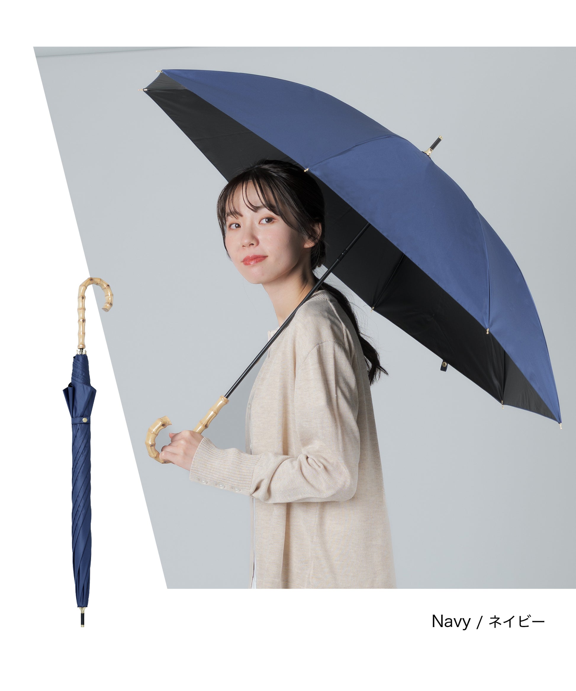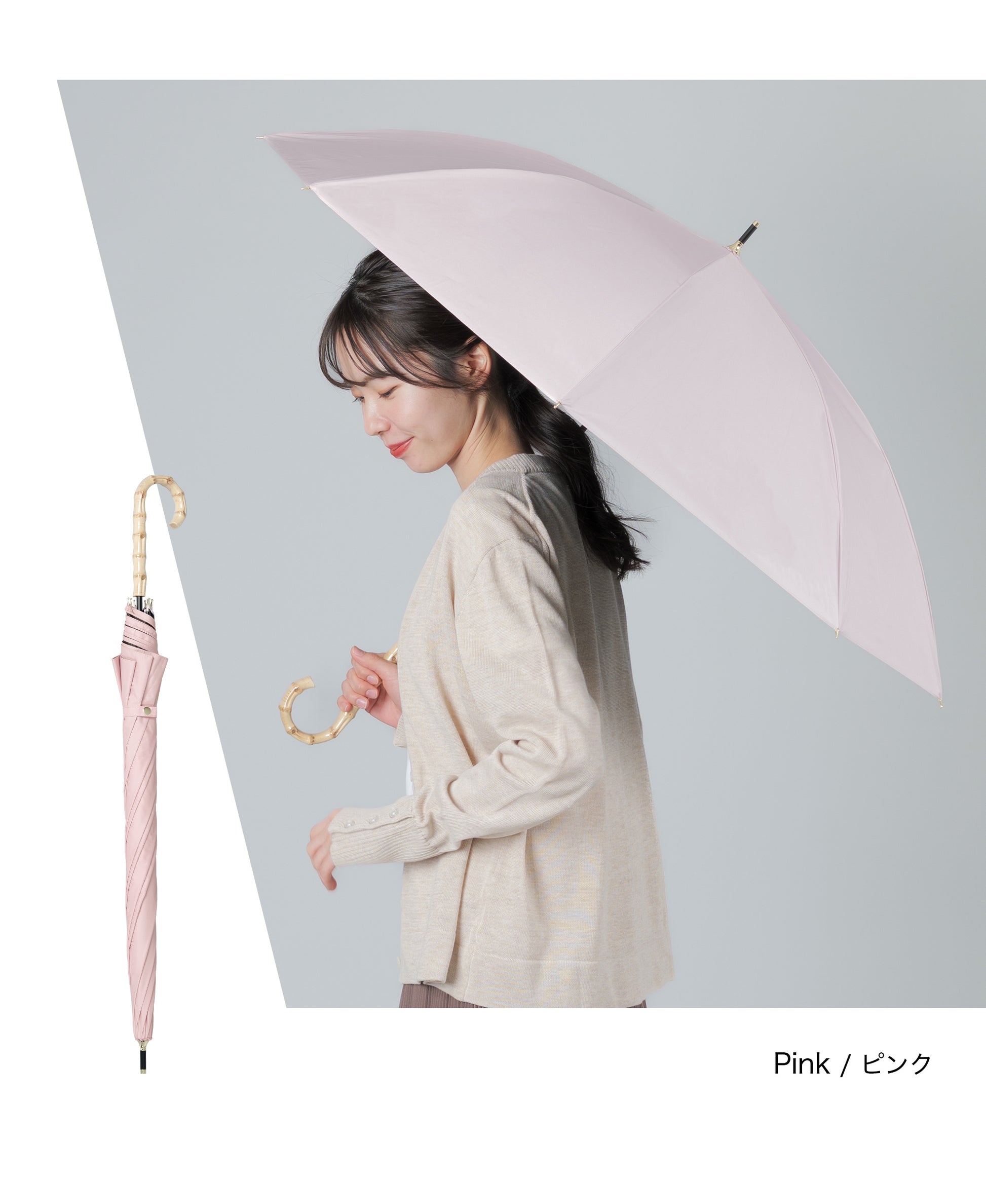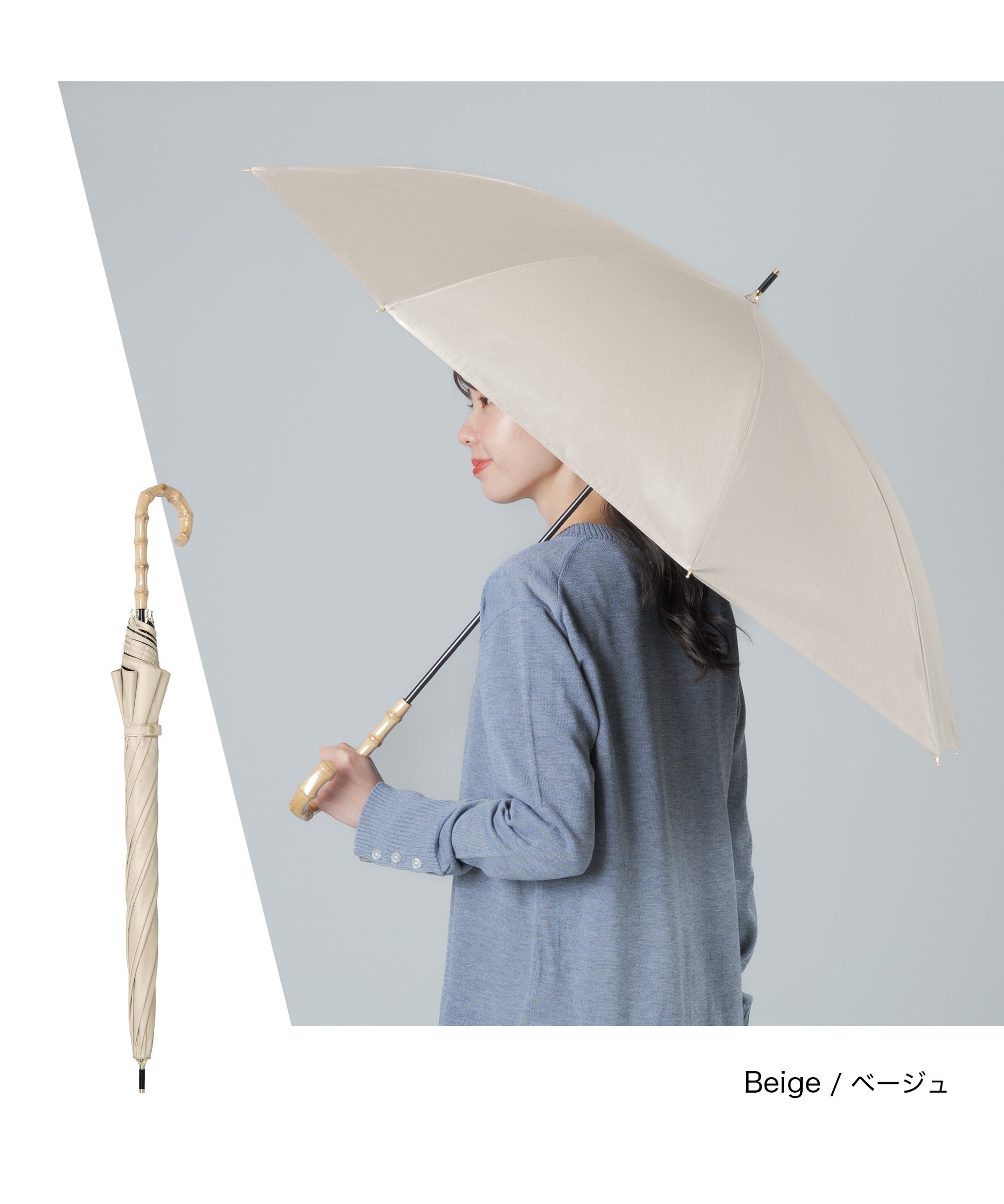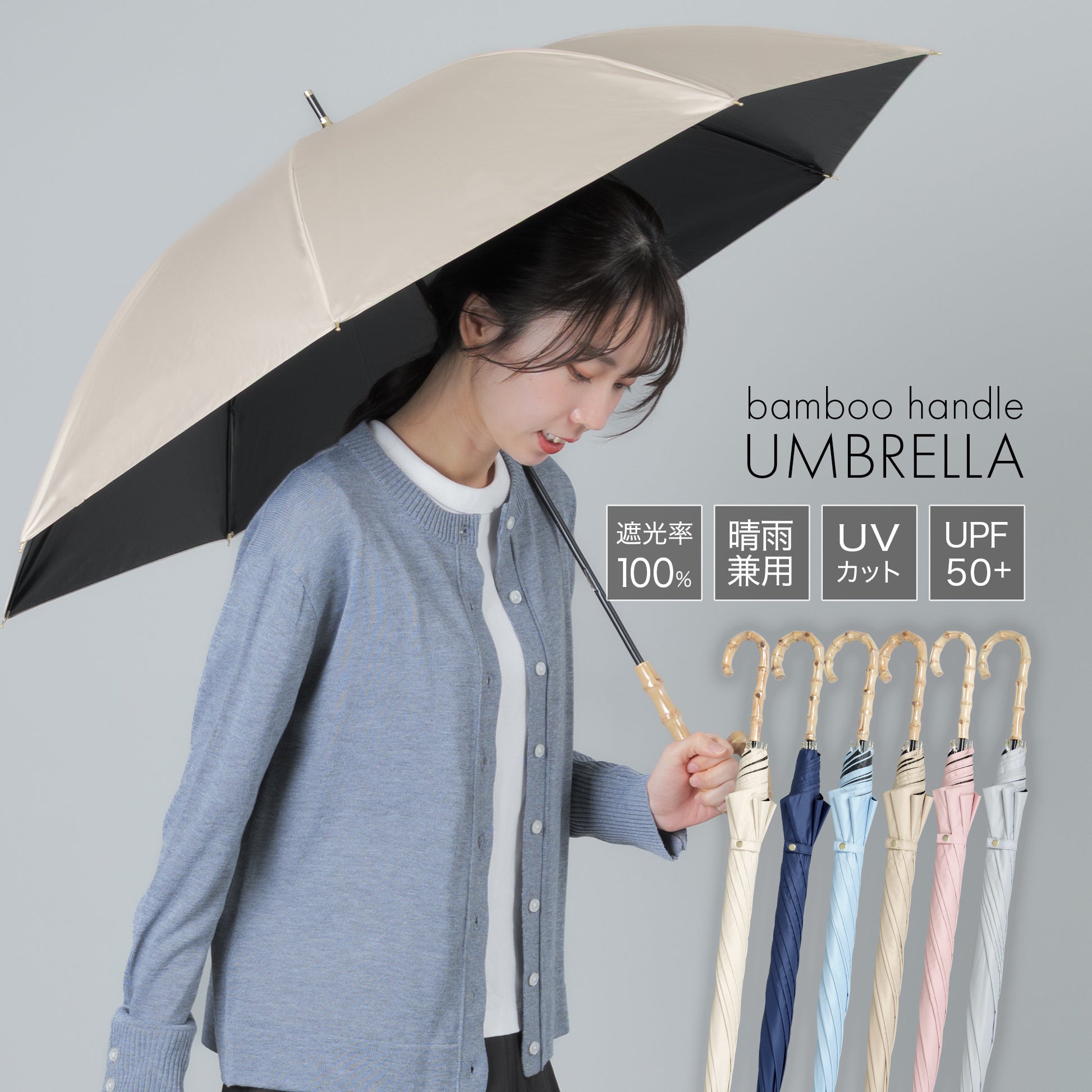 晴雨兼用長傘【守るための機能と、選びたくなる美しさ】日差しを遮るだけではなく、持つ人の印象までやわらかく整えてくれる一本。暑い季節を、少し優雅に。自然のぬくもりとともに、心地よい毎日をお過ごしください。【手元に、さりげない上質感を】ハンドルには天然竹を使用。自然素材ならではの節や色味は一点一点異なり、丸みのあるフォルムは手にしっくりと馴染み、持つだけでコーディネートに品を添えてくれます。通勤、学校行事、ショッピング、旅行。どんなシーンでも浮かない、落ち着いた佇まいです。【遮光率100%真夏の強い日差しもブロック】見た目だけでなく、機能もしっかり。・遮光率100%・UVカット率99.9%・UPF50+(最高値)紫外線を徹底的にカットし、日焼け対策はもちろん、シミ・そばかす対策を意識する世代にも心強い一本です。傘の下に入ると感じる、はっきりとした涼しさ。直射日光を遮ることで、体感温度の上昇も軽減します。暑さが厳しい季節のお出かけを、少し快適に。【晴れの日も、雨の日も】撥水加工を施した晴雨兼用タイプ。突然の通り雨にも慌てることなく、そのままお使いいただけます。季節を問わず活躍。日傘と雨傘を持ち替える必要がないため、荷物を増やしたくない日にも便利です。【大人の女性に似合うニュアンスカラー】派手すぎず、地味すぎない。肌なじみの良い上品カラーをご用意しました。きれいめコーデにも、カジュアルにも自然に馴染みます。【商品仕様】タイプ:晴雨兼用日傘遮光率:100%UVカット率:100%UPF:50+撥水加工:ありカラー:ネイビー/ピンク/グレー/サックス/アイボリー/ベージュハンドル素材:天然竹
