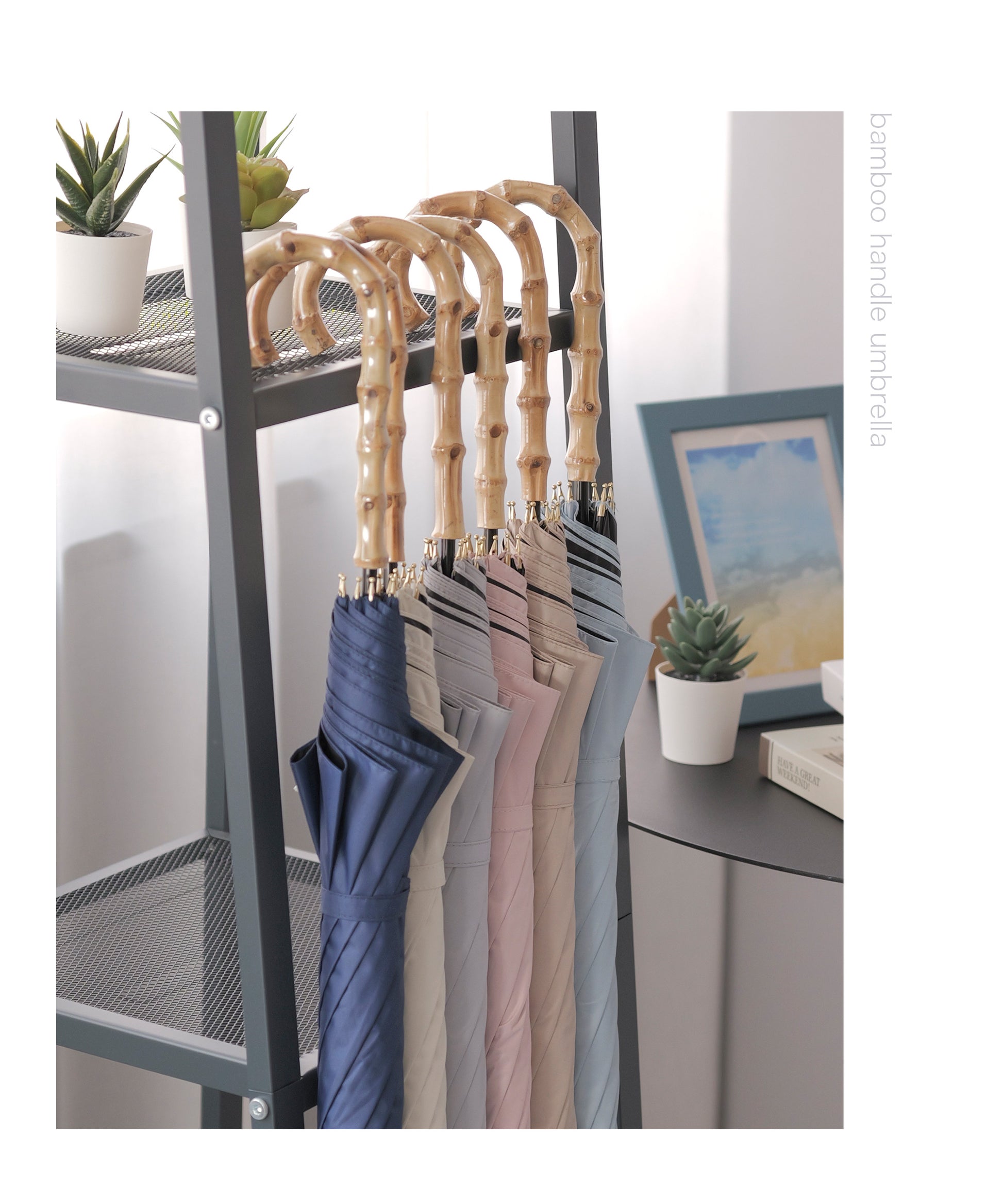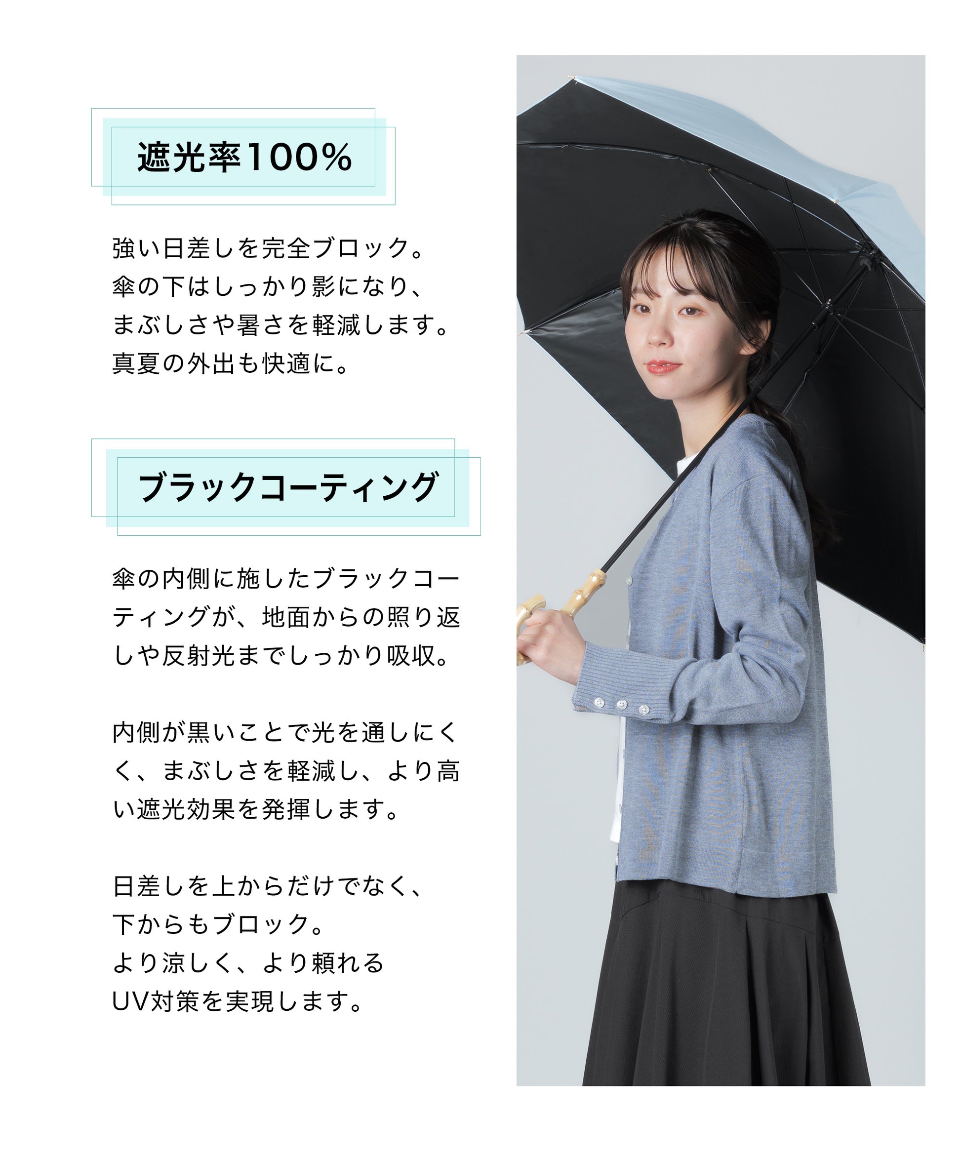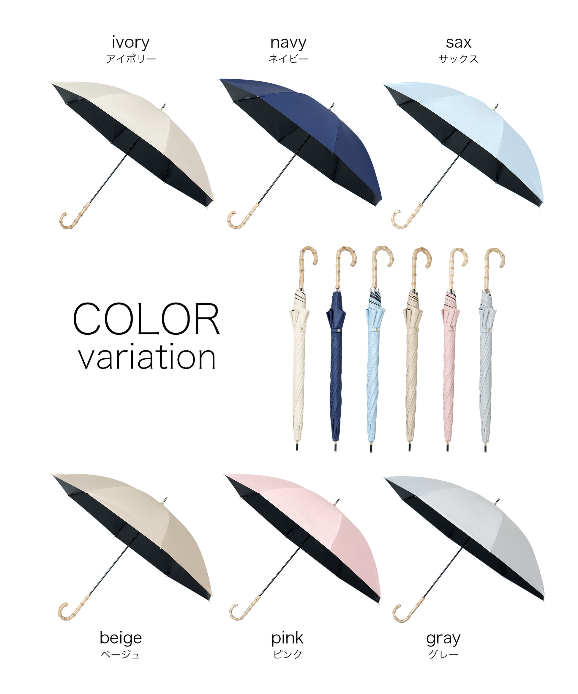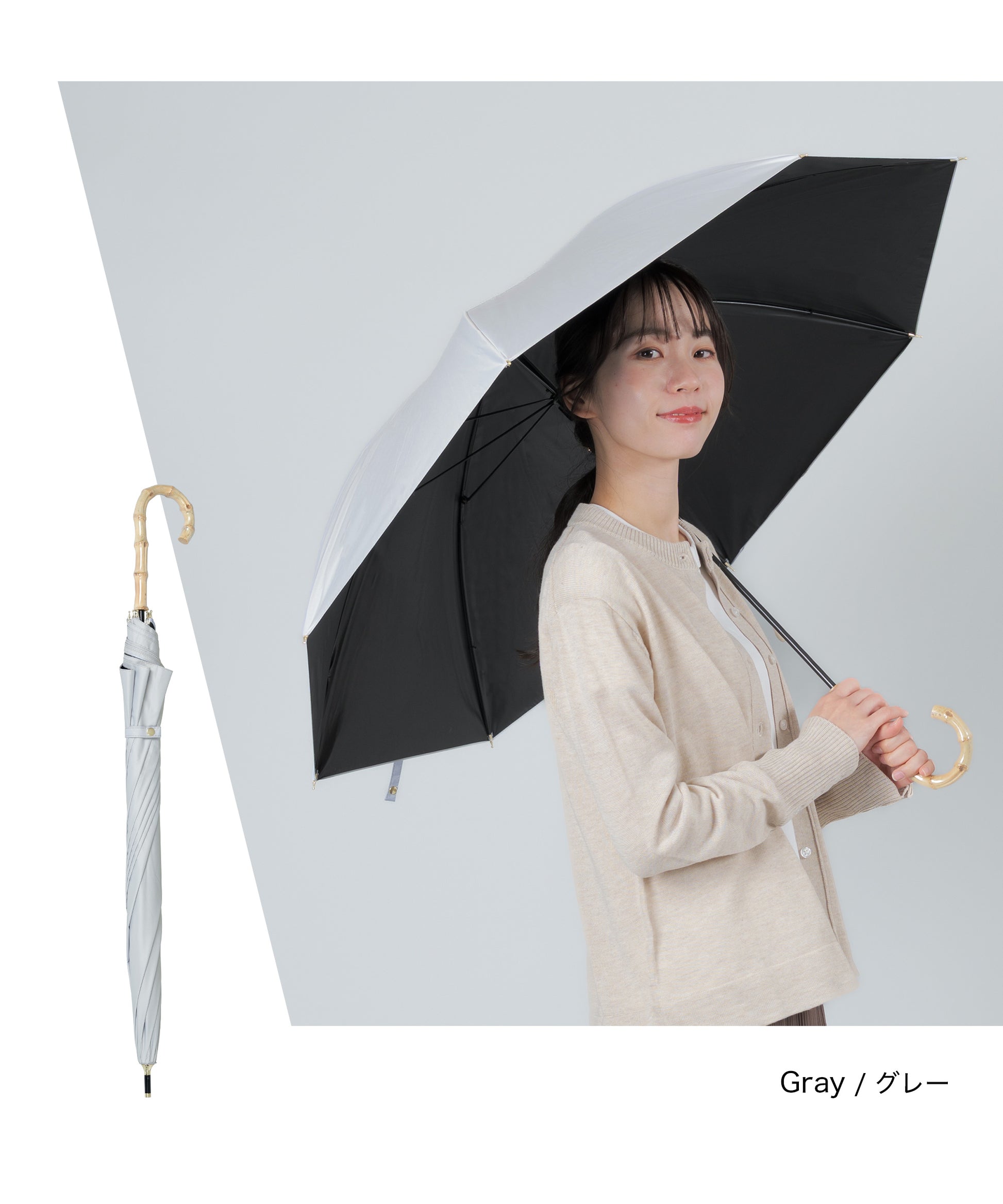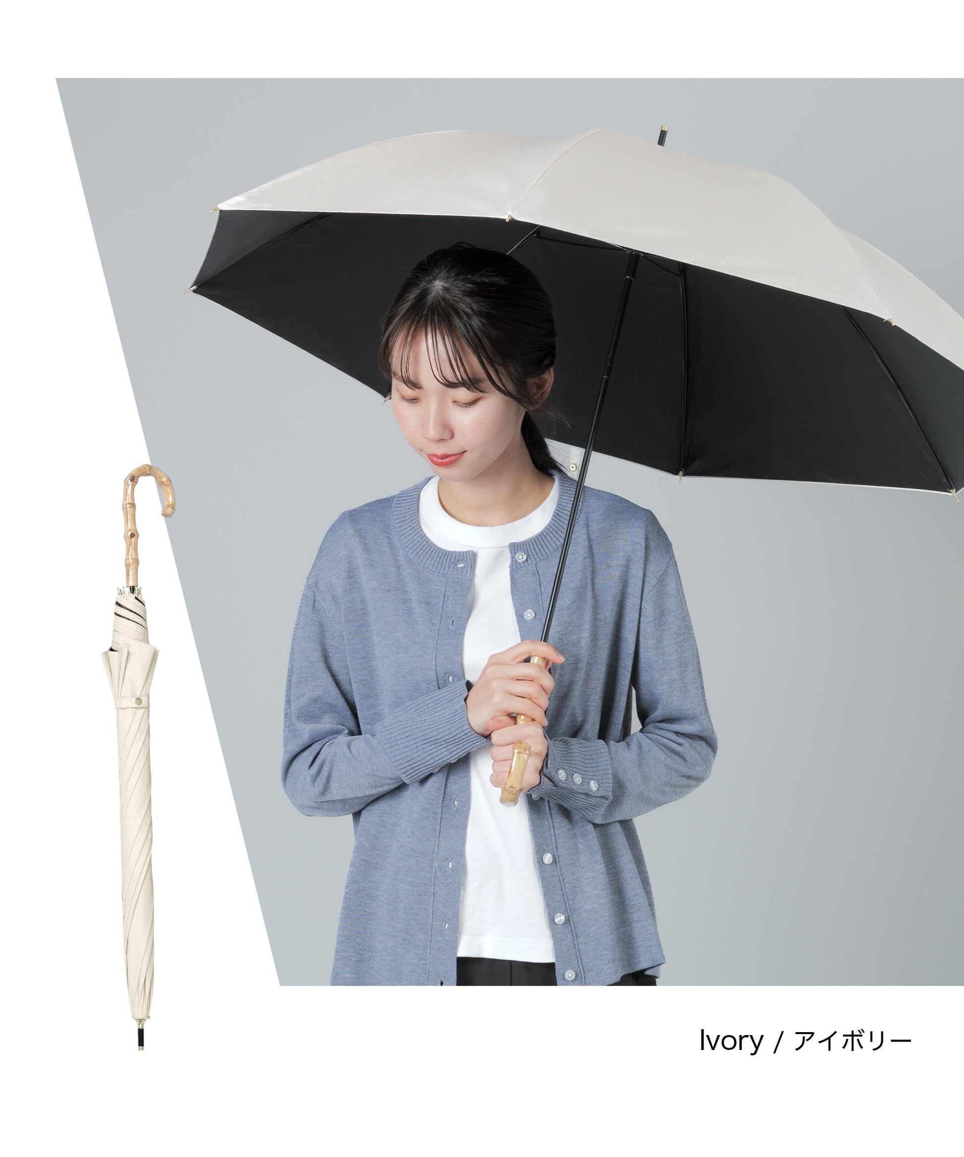 晴雨兼用長傘【守るための機能と、選びたくなる美しさ】日差しを遮るだけではなく、持つ人の印象までやわらかく整えてくれる一本。暑い季節を、少し優雅に。自然のぬくもりとともに、心地よい毎日をお過ごしください。【手元に、さりげない上質感を】ハンドルには天然竹を使用。自然素材ならではの節や色味は一点一点異なり、丸みのあるフォルムは手にしっくりと馴染み、持つだけでコーディネートに品を添えてくれます。通勤、学校行事、ショッピング、旅行。どんなシーンでも浮かない、落ち着いた佇まいです。【遮光率100%真夏の強い日差しもブロック】見た目だけでなく、機能もしっかり。・遮光率100%・UVカット率99.9%・UPF50+(最高値)紫外線を徹底的にカットし、日焼け対策はもちろん、シミ・そばかす対策を意識する世代にも心強い一本です。傘の下に入ると感じる、はっきりとした涼しさ。直射日光を遮ることで、体感温度の上昇も軽減します。暑さが厳しい季節のお出かけを、少し快適に。【晴れの日も、雨の日も】撥水加工を施した晴雨兼用タイプ。突然の通り雨にも慌てることなく、そのままお使いいただけます。季節を問わず活躍。日傘と雨傘を持ち替える必要がないため、荷物を増やしたくない日にも便利です。【大人の女性に似合うニュアンスカラー】派手すぎず、地味すぎない。肌なじみの良い上品カラーをご用意しました。きれいめコーデにも、カジュアルにも自然に馴染みます。【商品仕様】タイプ:晴雨兼用日傘遮光率:100%UVカット率:100%UPF:50+撥水加工:ありカラー:ネイビー/ピンク/グレー/サックス/アイボリー/ベージュハンドル素材:天然竹