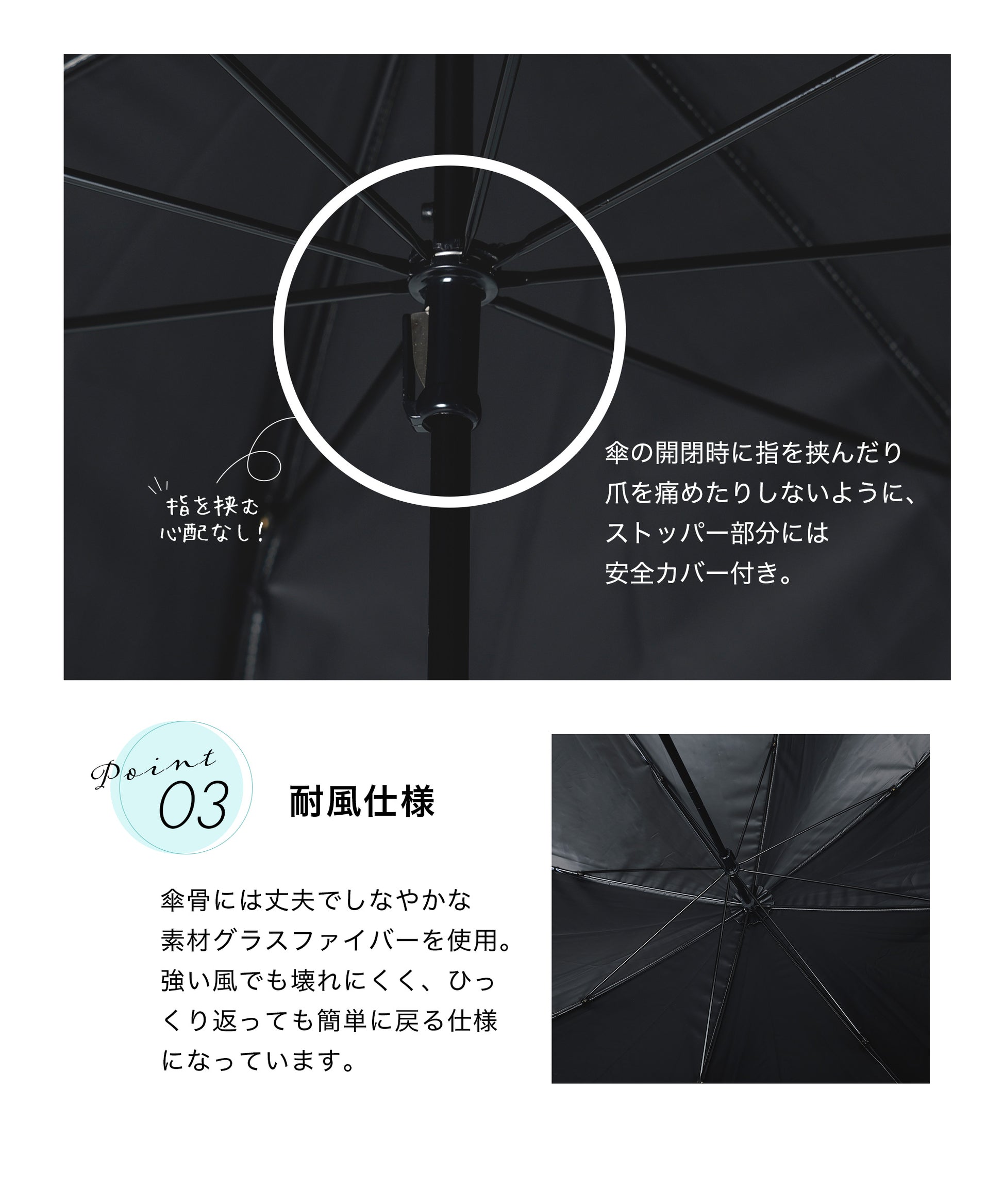 生地:ポリエステル 親骨:アルミ、グラスファイバー 中棒:アルミ 手元:バンブー 開閉:手開き
