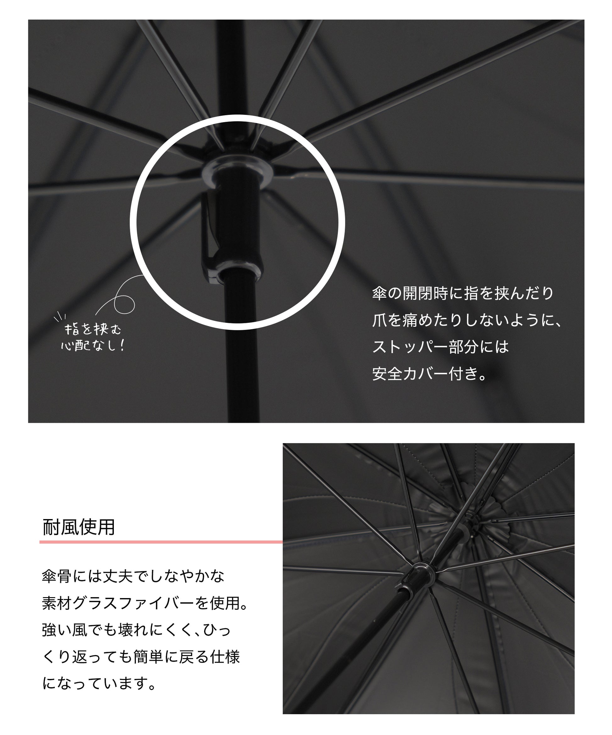 傘の開閉時に指を挟んだり爪を痛めたりしないように、ストッパー部分には安全カバー付き。