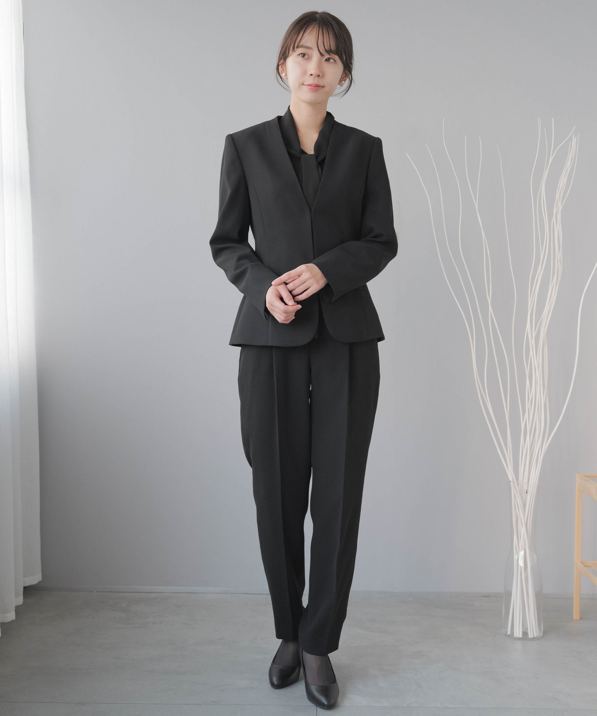 上品でありながら動きやすい使い回しもできる冠婚葬祭対応のブラックフォーマルトレンドのノーカラージャケットと美シルエットのテーパードパンツ動きやすく足捌きの良いパンツスーツは子育て中のママにもおすすめノーカラージャケットのすっきりした印象と、センタープリーツの入ったパンツが縦長ラインを強調してすらっとしたシルエット取り外し可能なボウタイを外すことでシンプルなネックラインと相まってすっきりした印象に変化足捌きが楽で背面がゴムシャーリング仕様さらに弱ストレッチ素材でしゃがむ、立ち上がるといった動作の多い子育て中におすすめの礼服何かと便利なポケットも両脇についているのも嬉しいポイント素材は濃染加工を程した深い黒の喪服専用素材ネットに入れて手洗いモードで家庭で洗濯が可能コサージュをつけて卒業式にも、ブラウスを白に変えて華やかに着こなせますジャケットとパンツで入学 卒業のセレモニー、パンツ単品でビジネスシーンにも使いまわせますモデル:163cm / 9号着用生産国:ベトナム
