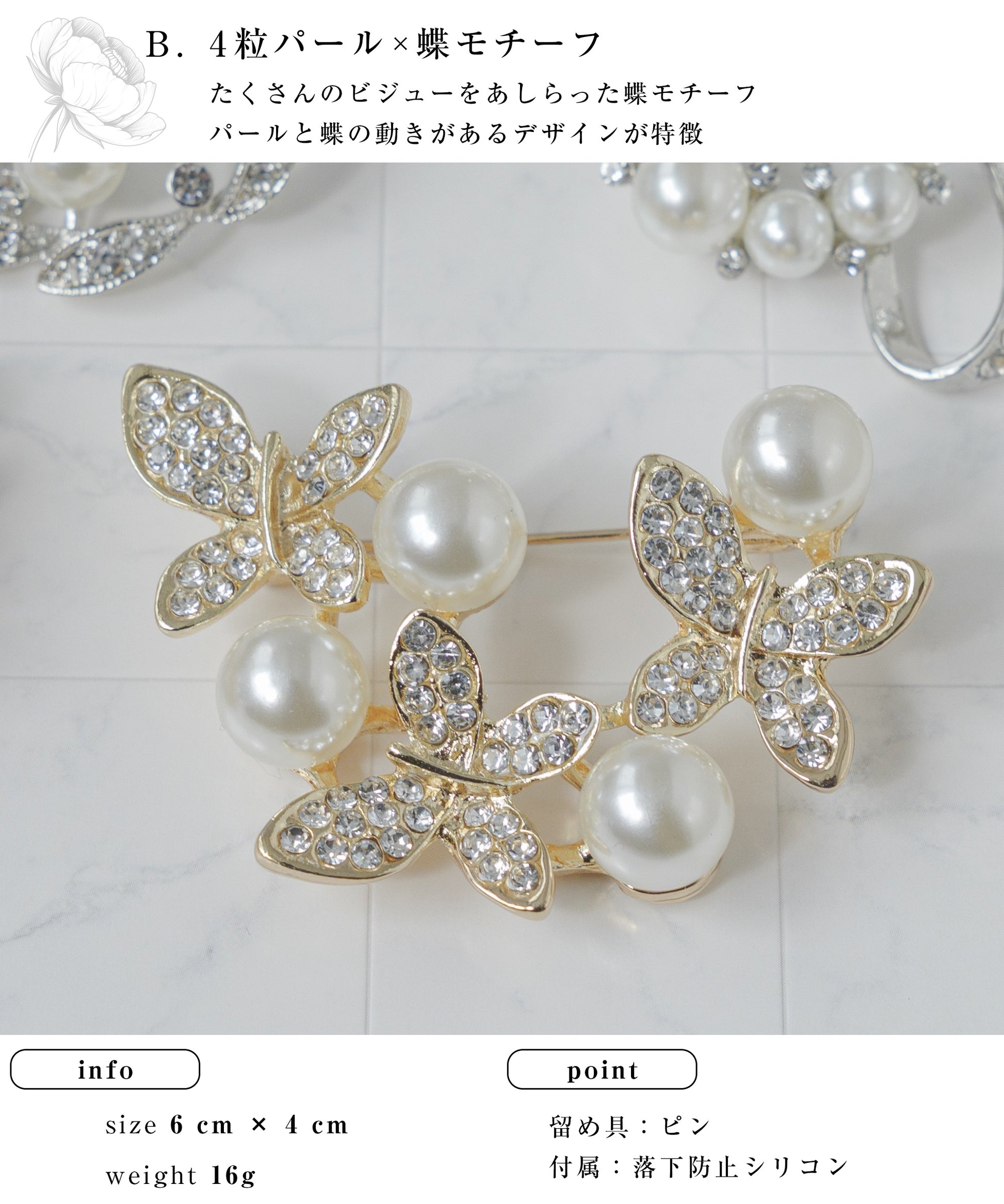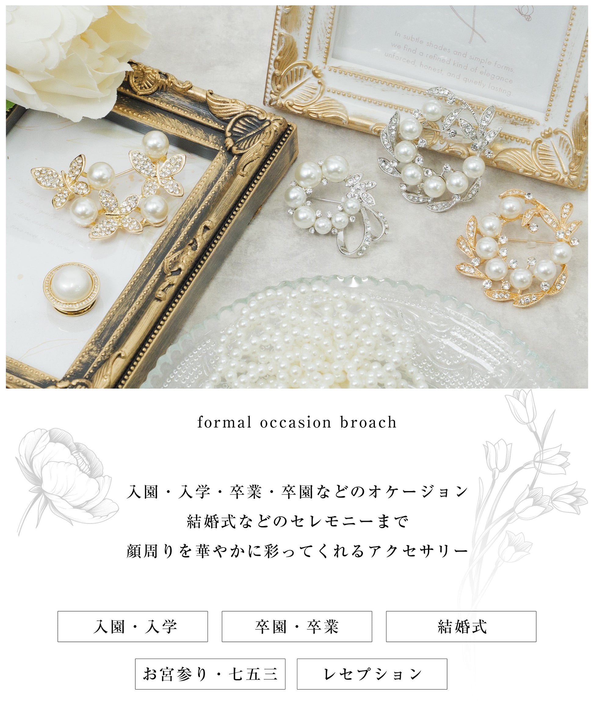 入園、入学、卒業、卒園などのオケージョン結婚式などのセレモニーまで顔周りを華やかに彩ってくれるアクセサリーフォーマルブローチはセレモニーシーンやブライダルなどで光の反射で顔周りを明るく見せてくれるアクセサリー