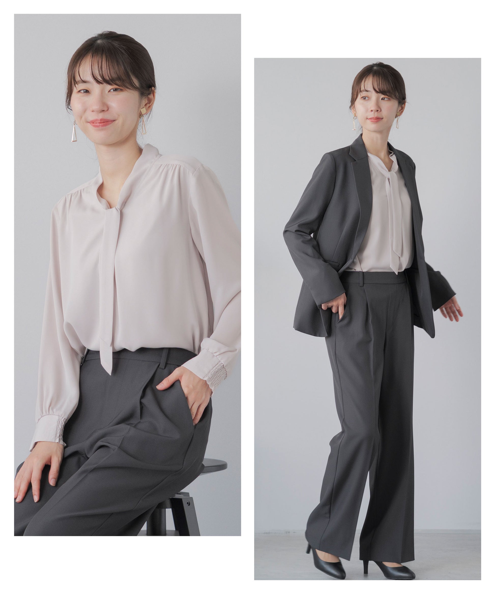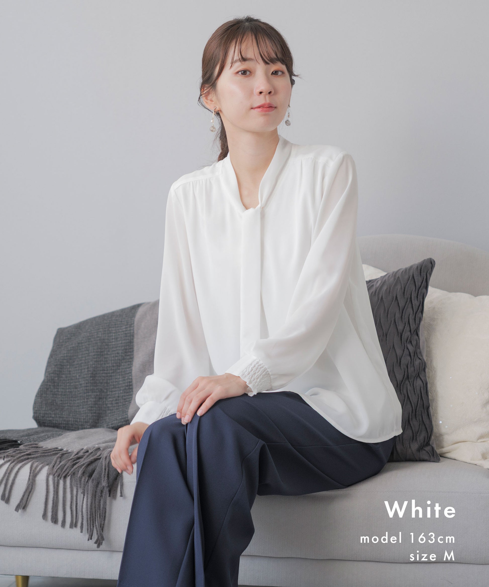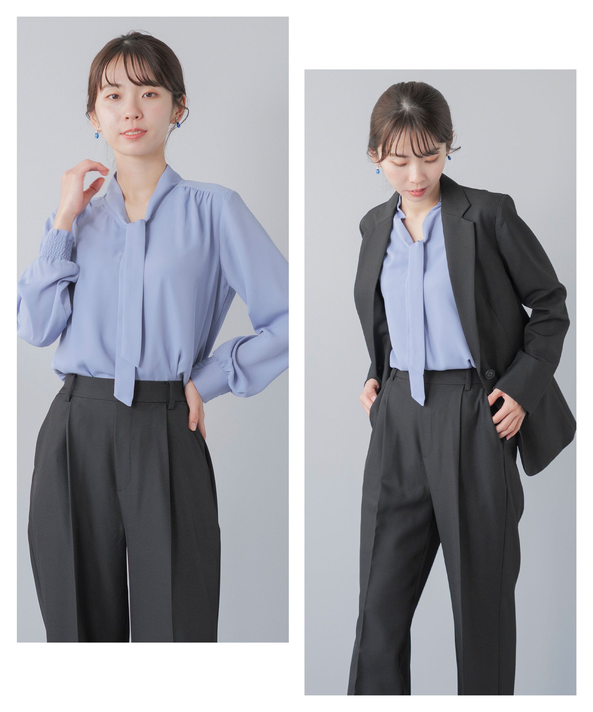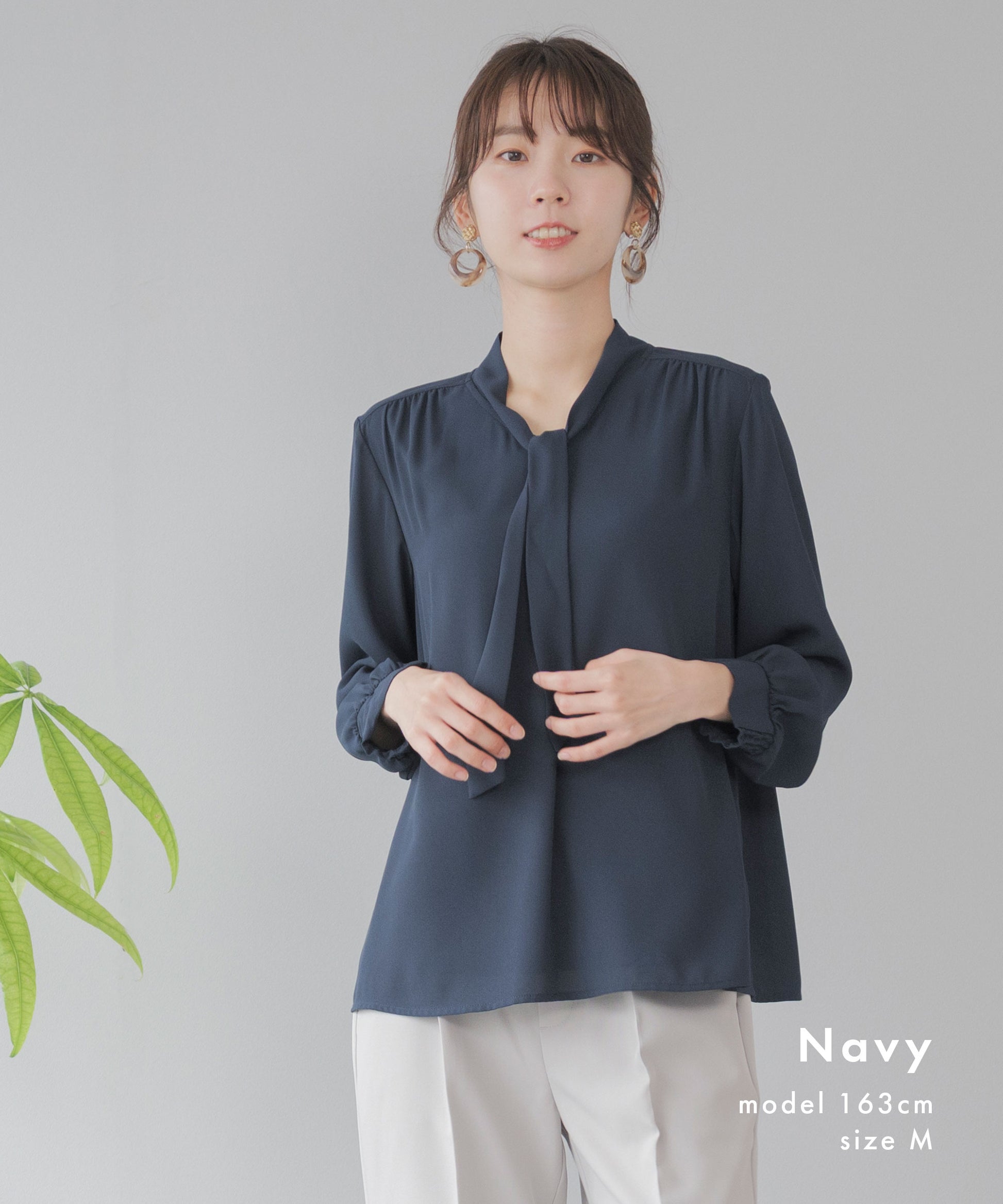 袖口シャーリングとカットソー裏地で上品さと使いやすさを両立したボウタイブラウス