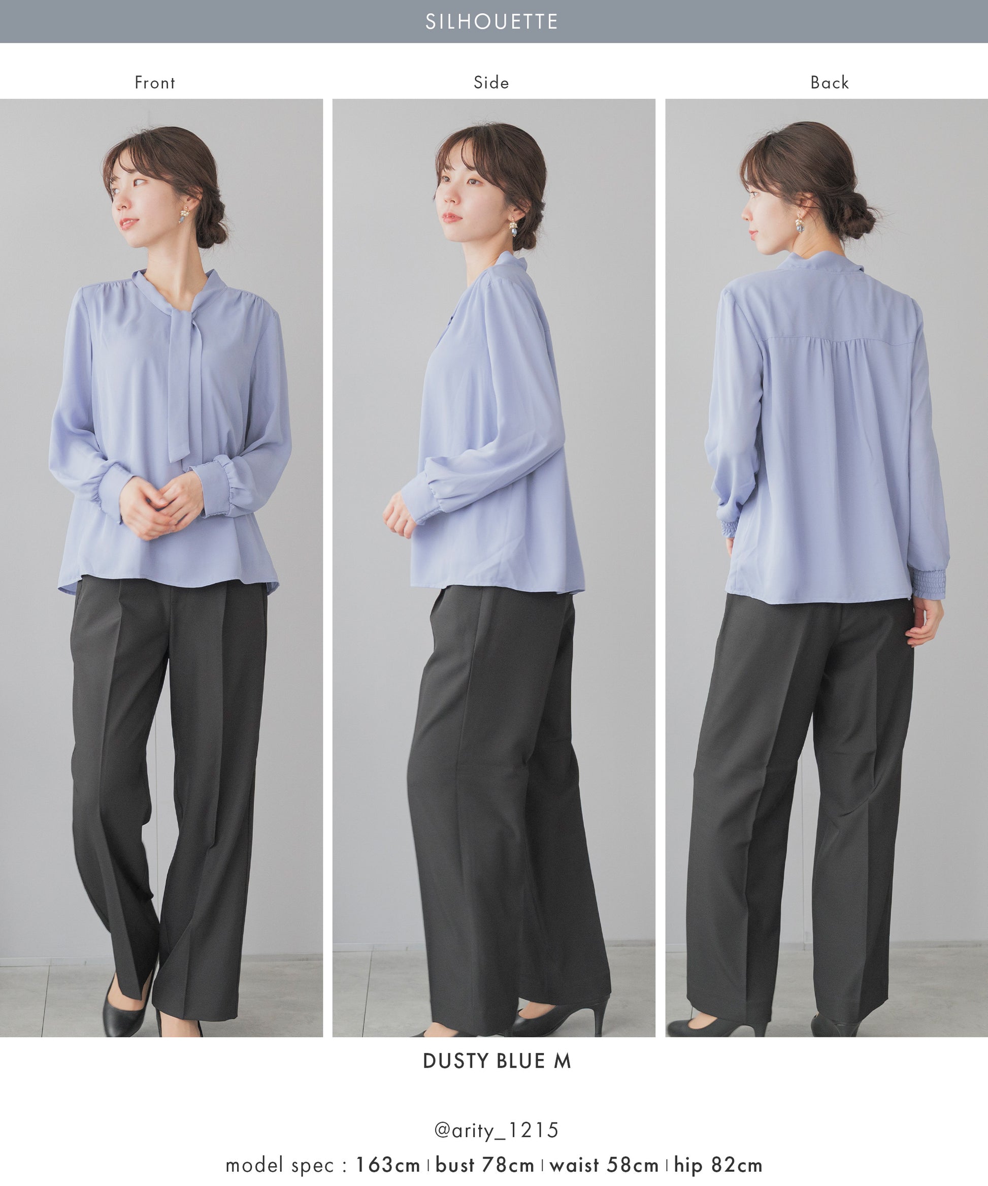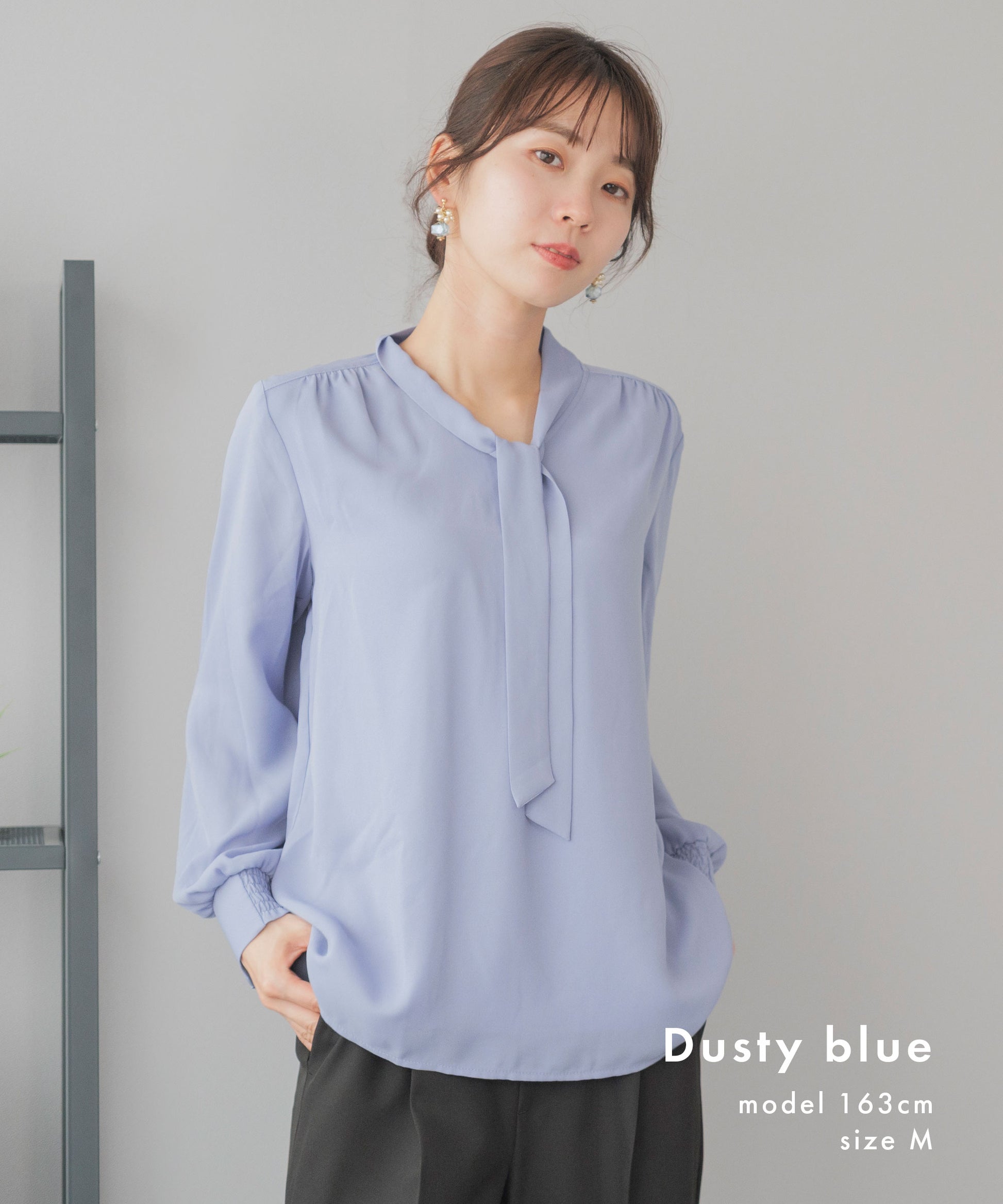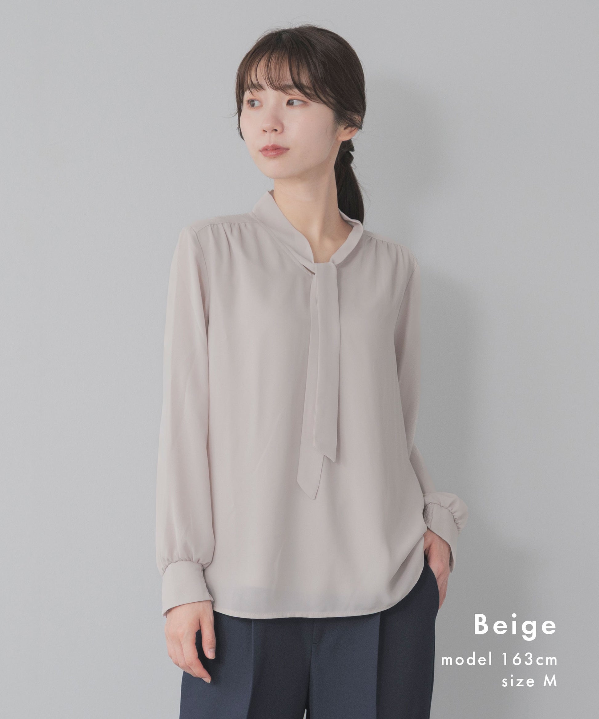 袖口シャーリングとカットソー裏地で上品さと使いやすさを両立したボウタイブラウス