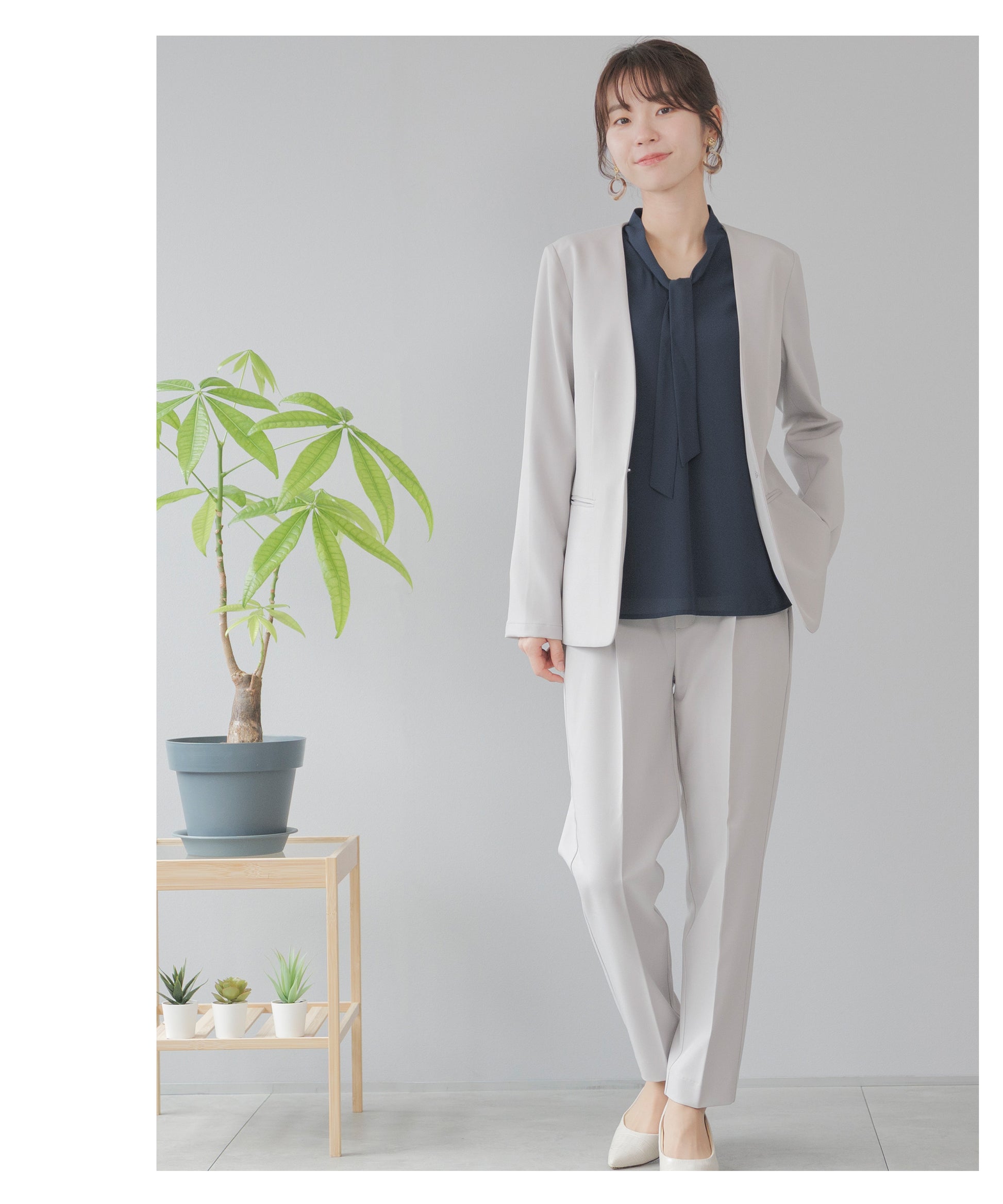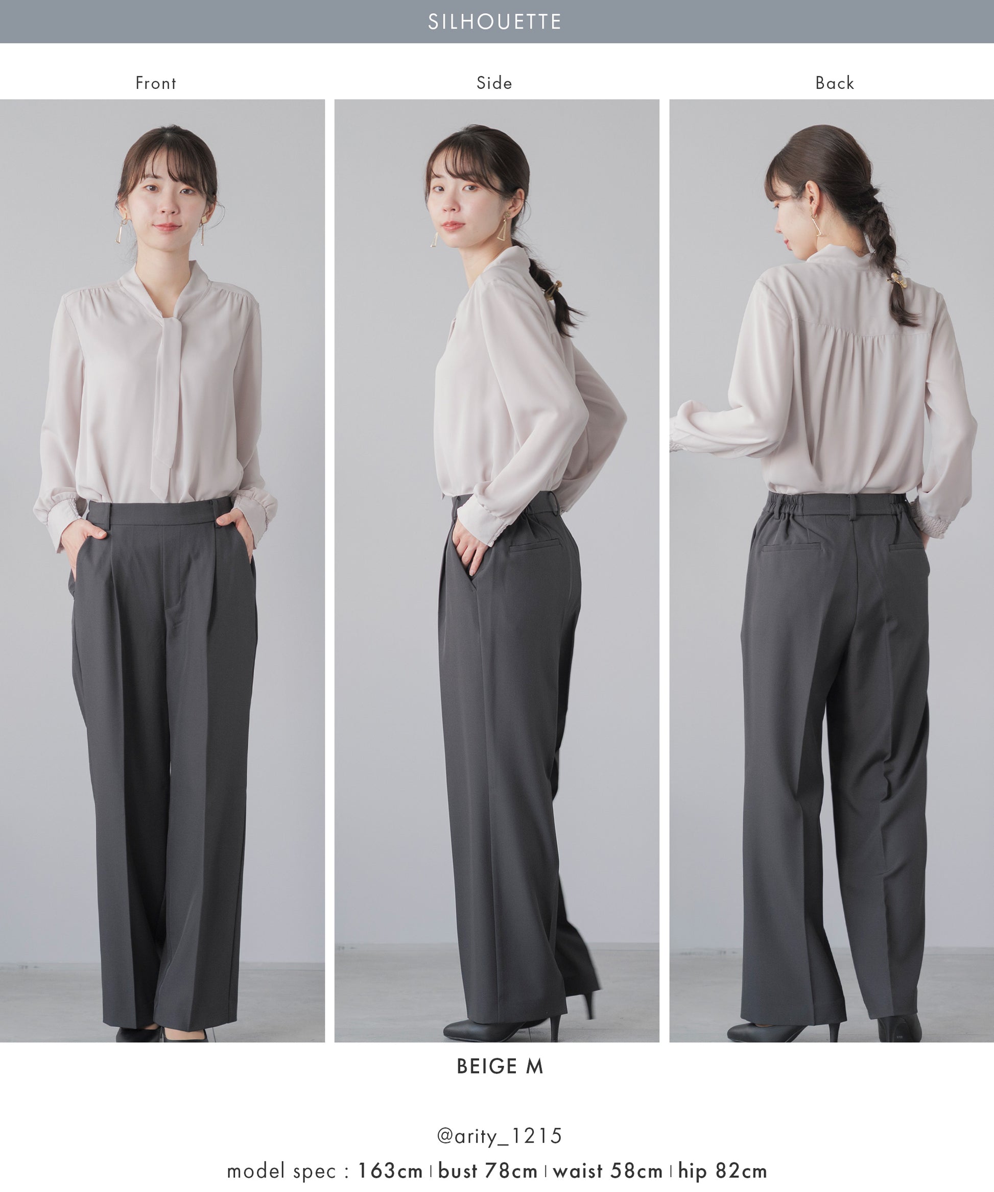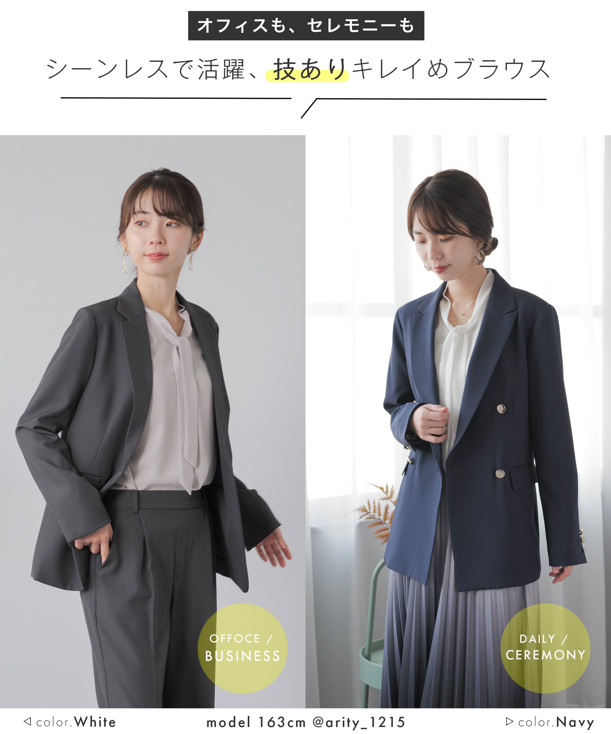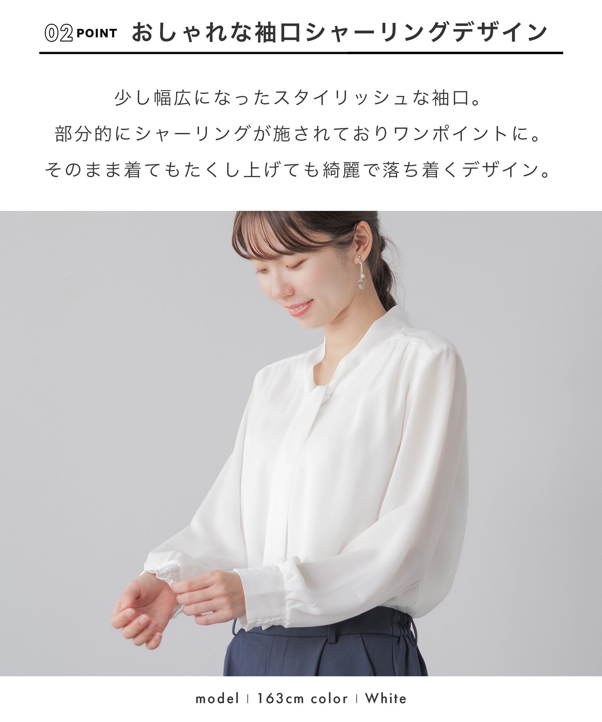 袖口シャーリングとカットソー裏地で上品さと使いやすさを両立したボウタイブラウス