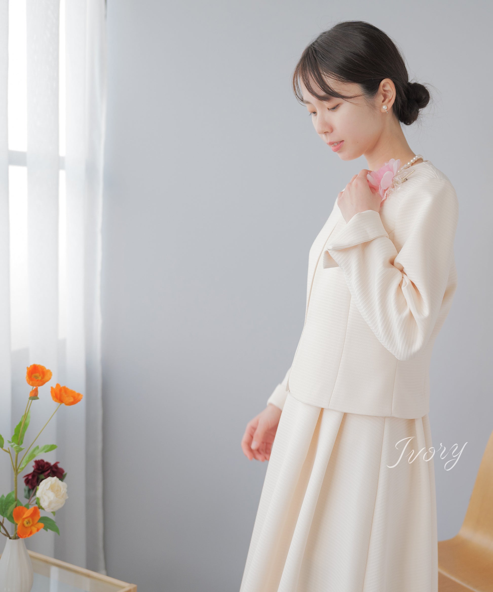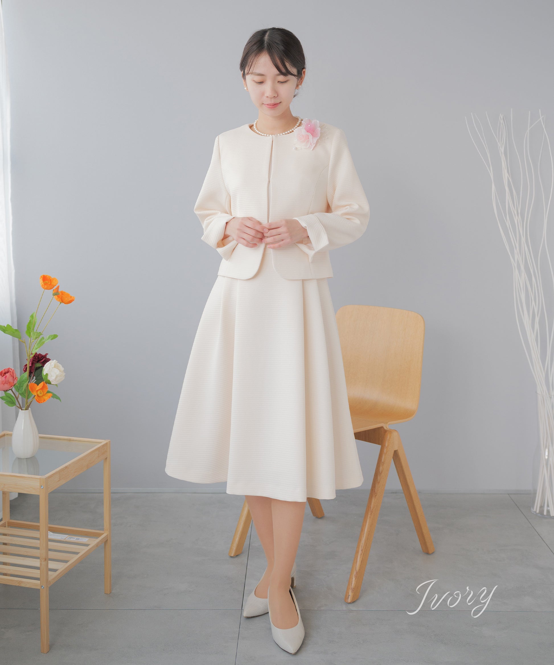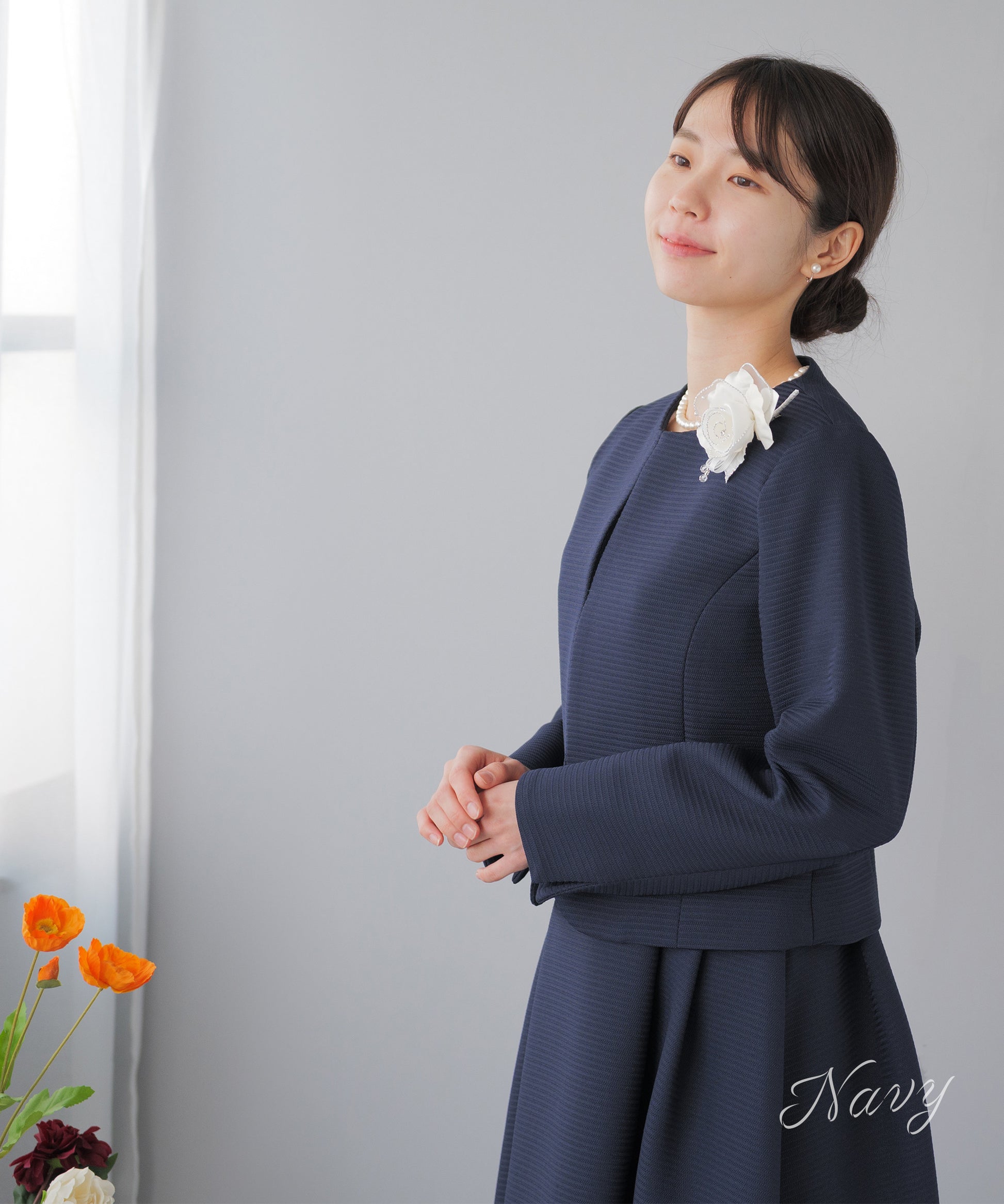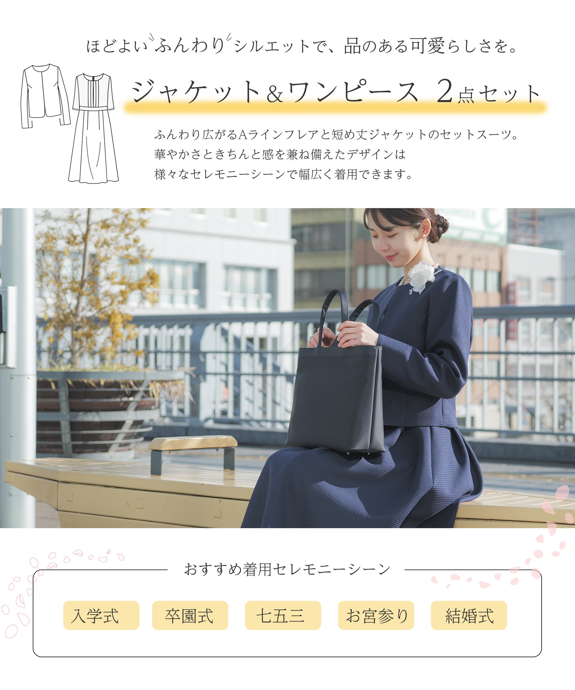 ふんわり広がるAラインフレアワンピースと短め丈ジャケットのセットスーツ。