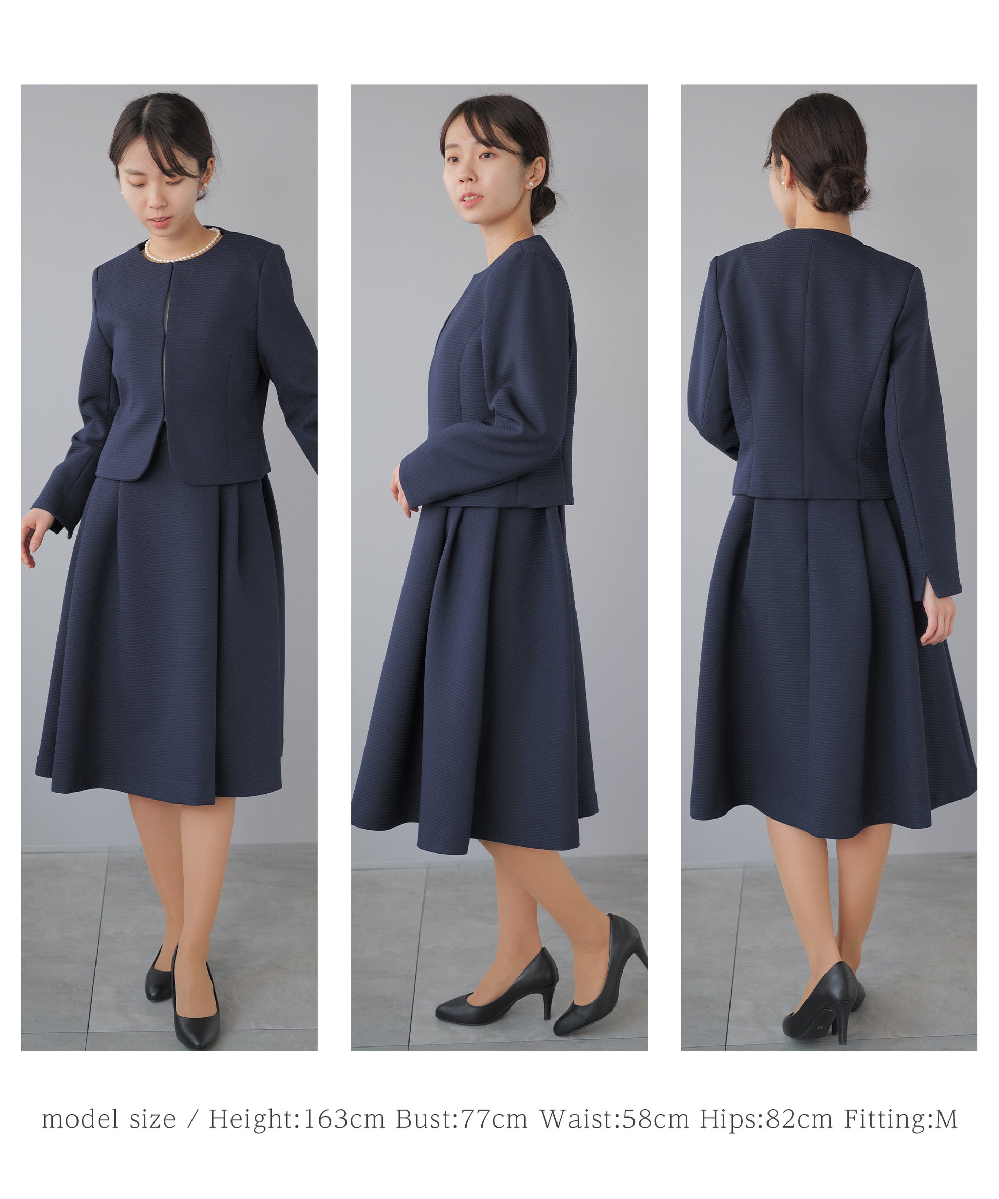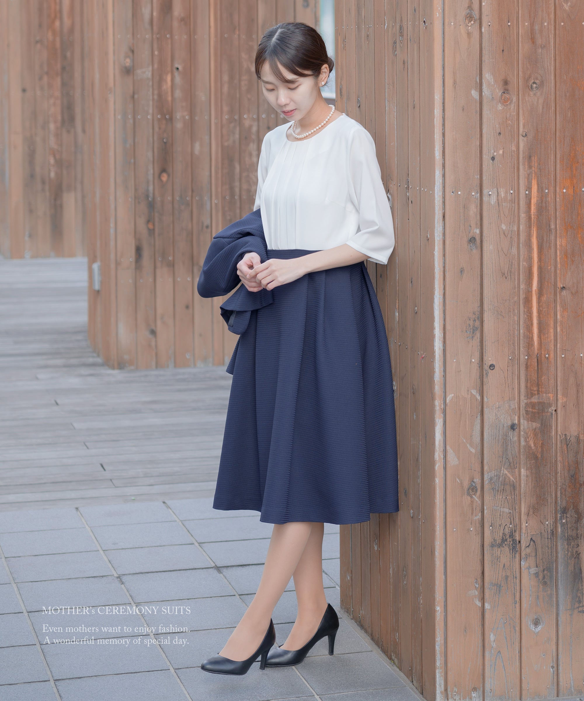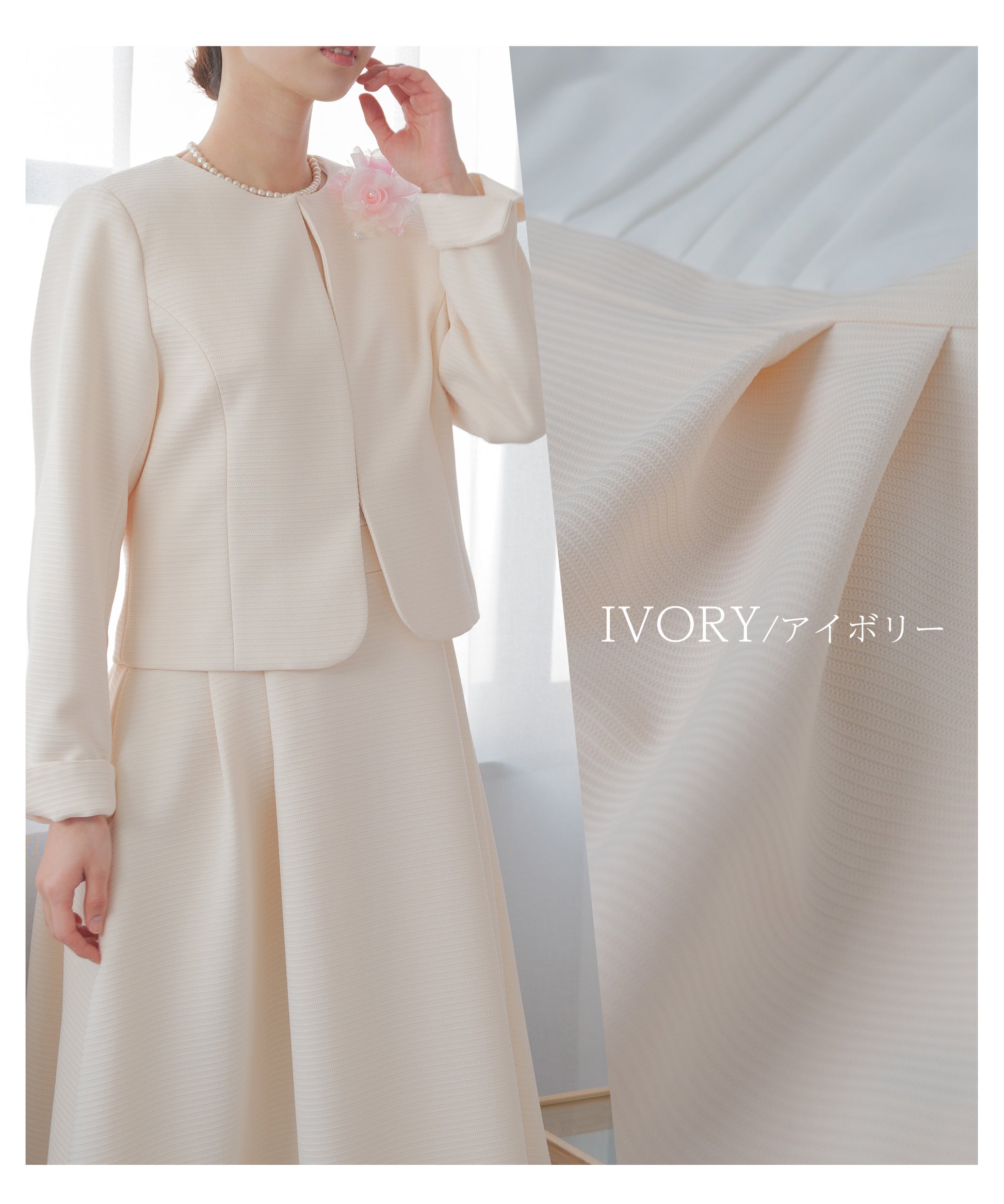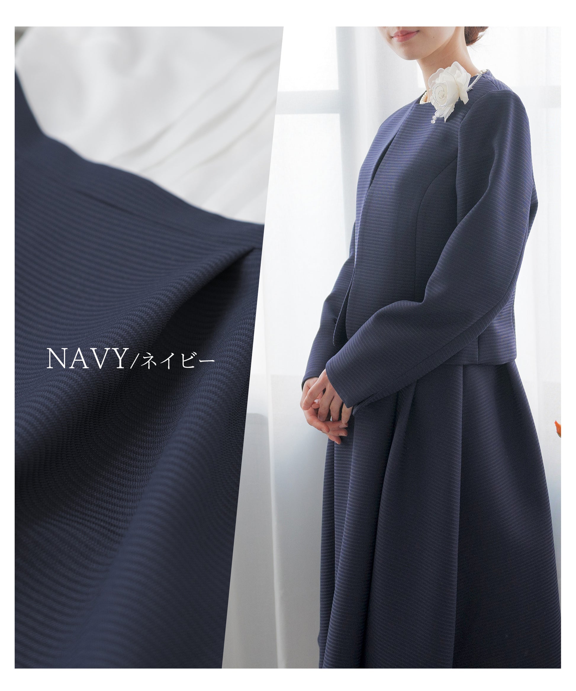 ふんわり広がるAラインフレアワンピースと短め丈ジャケットのセットスーツ。