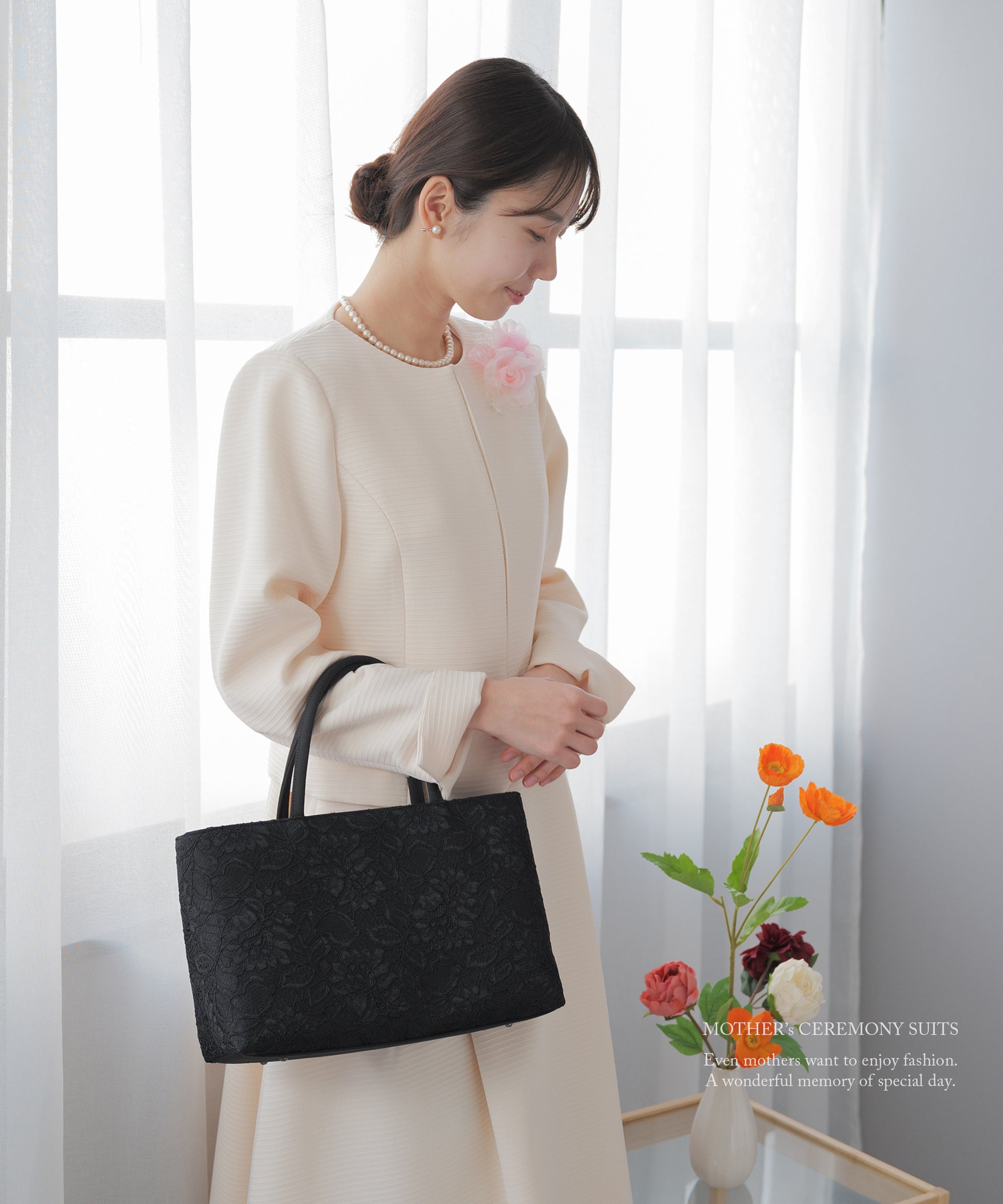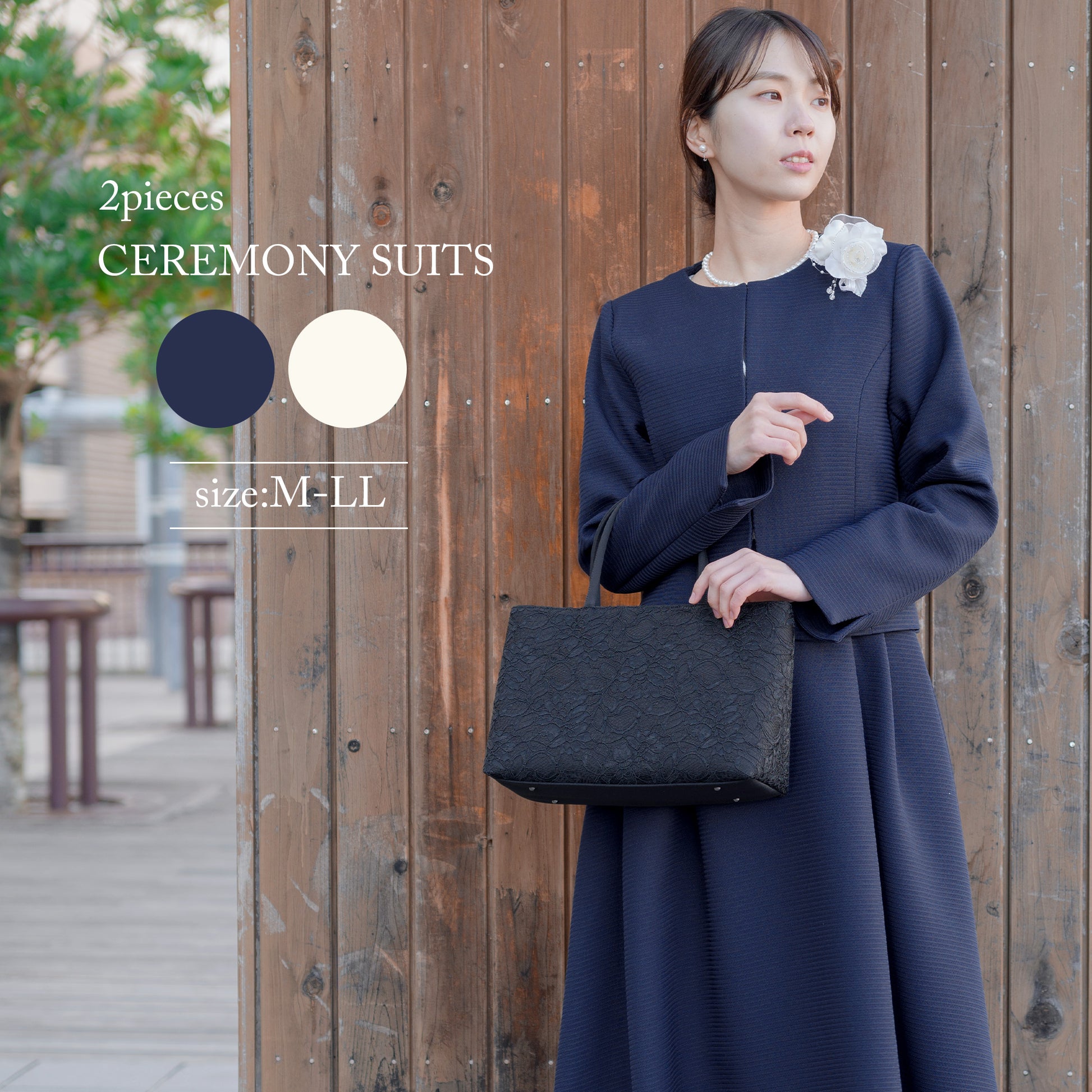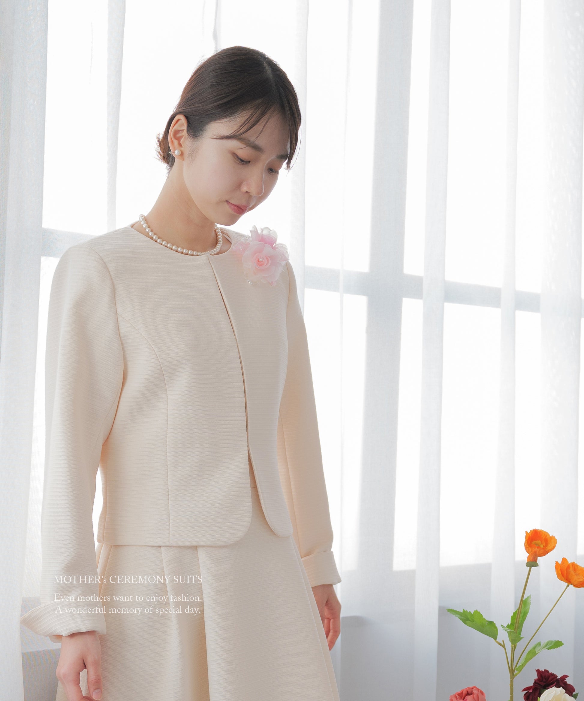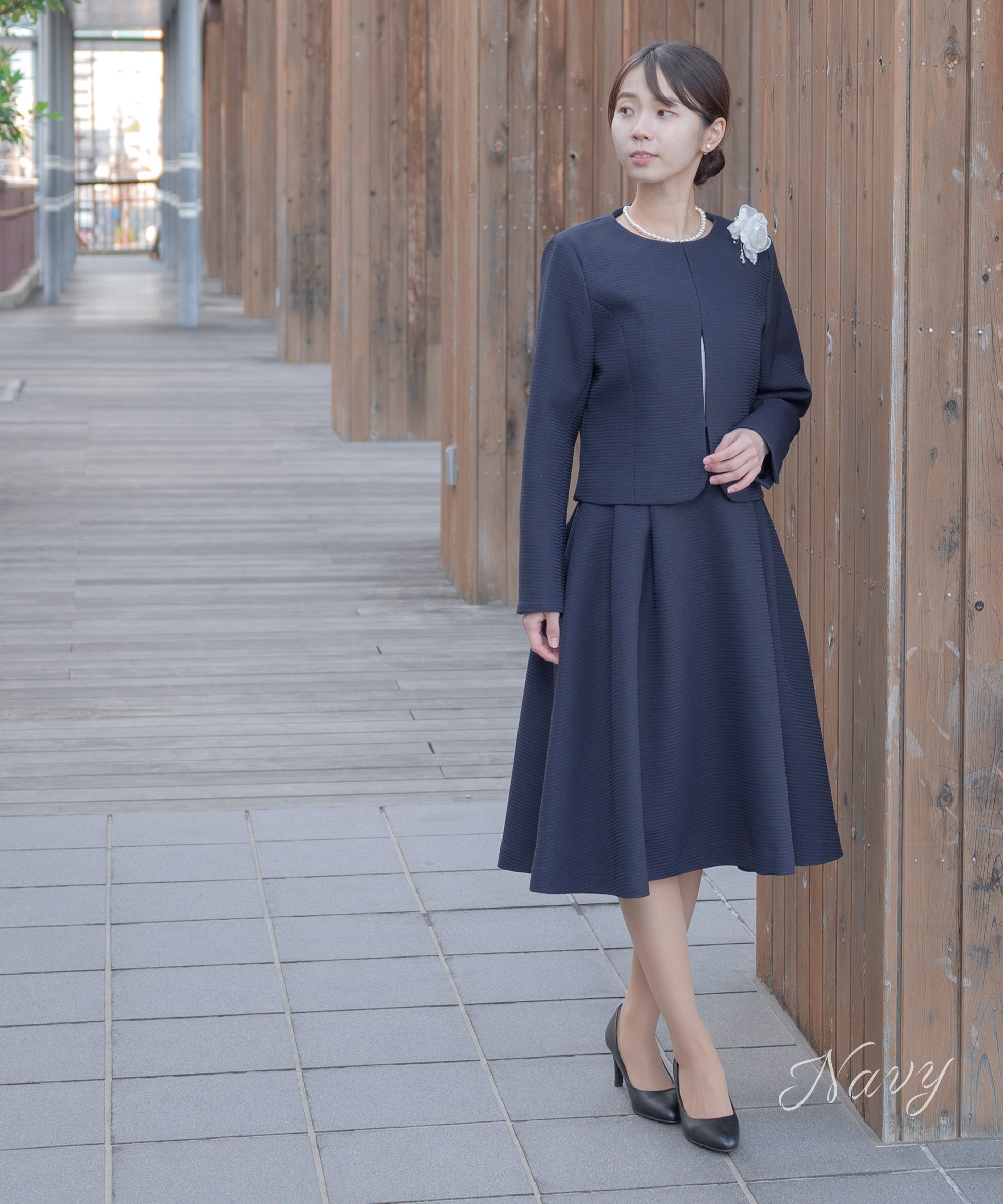 ふんわり広がるAラインフレアワンピースと短め丈ジャケットのセットスーツ。