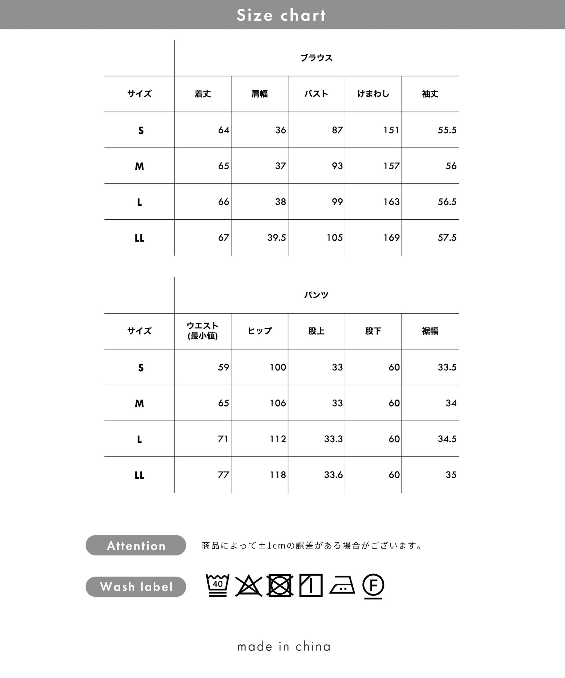 | Size | ウエスト | ヒップ | 股上 | 股下 | 裾幅 |