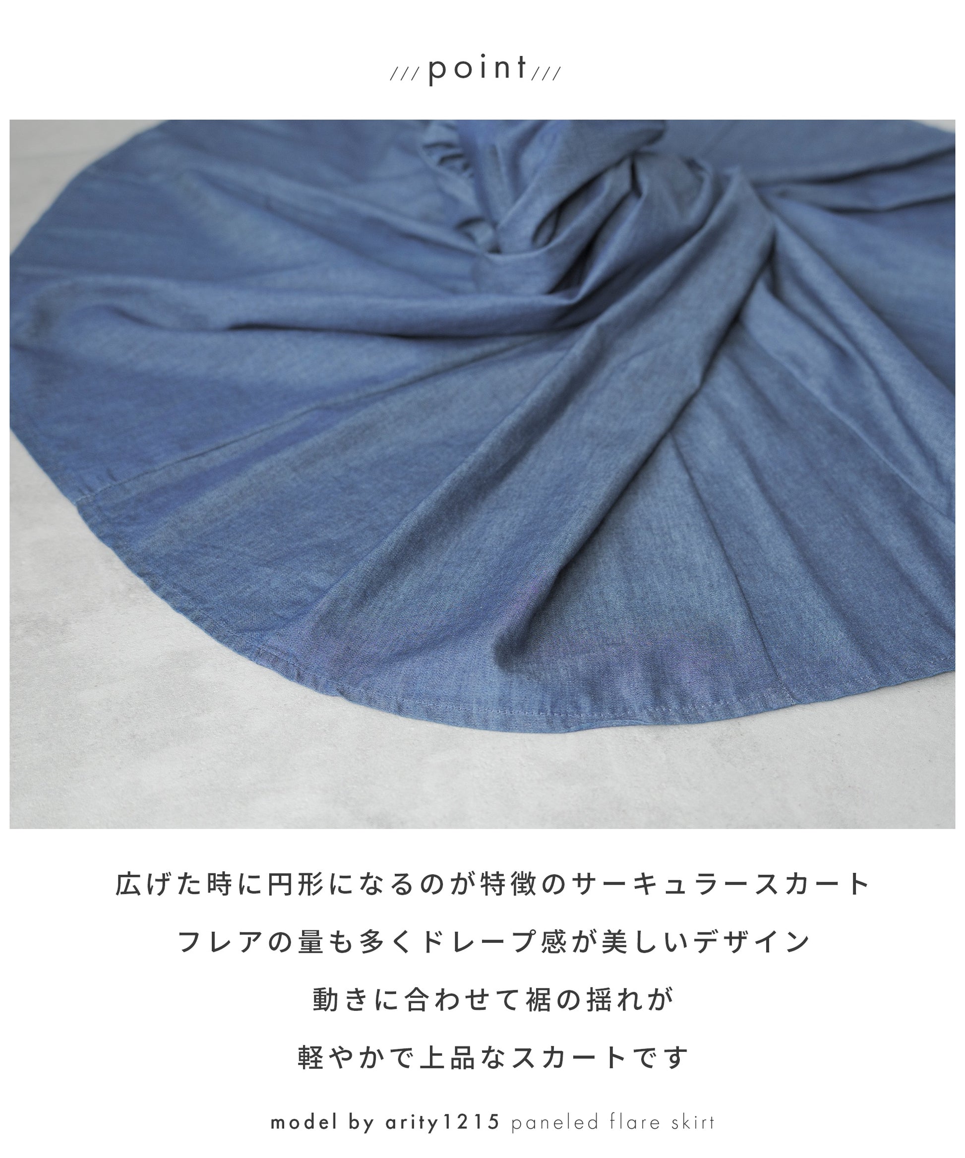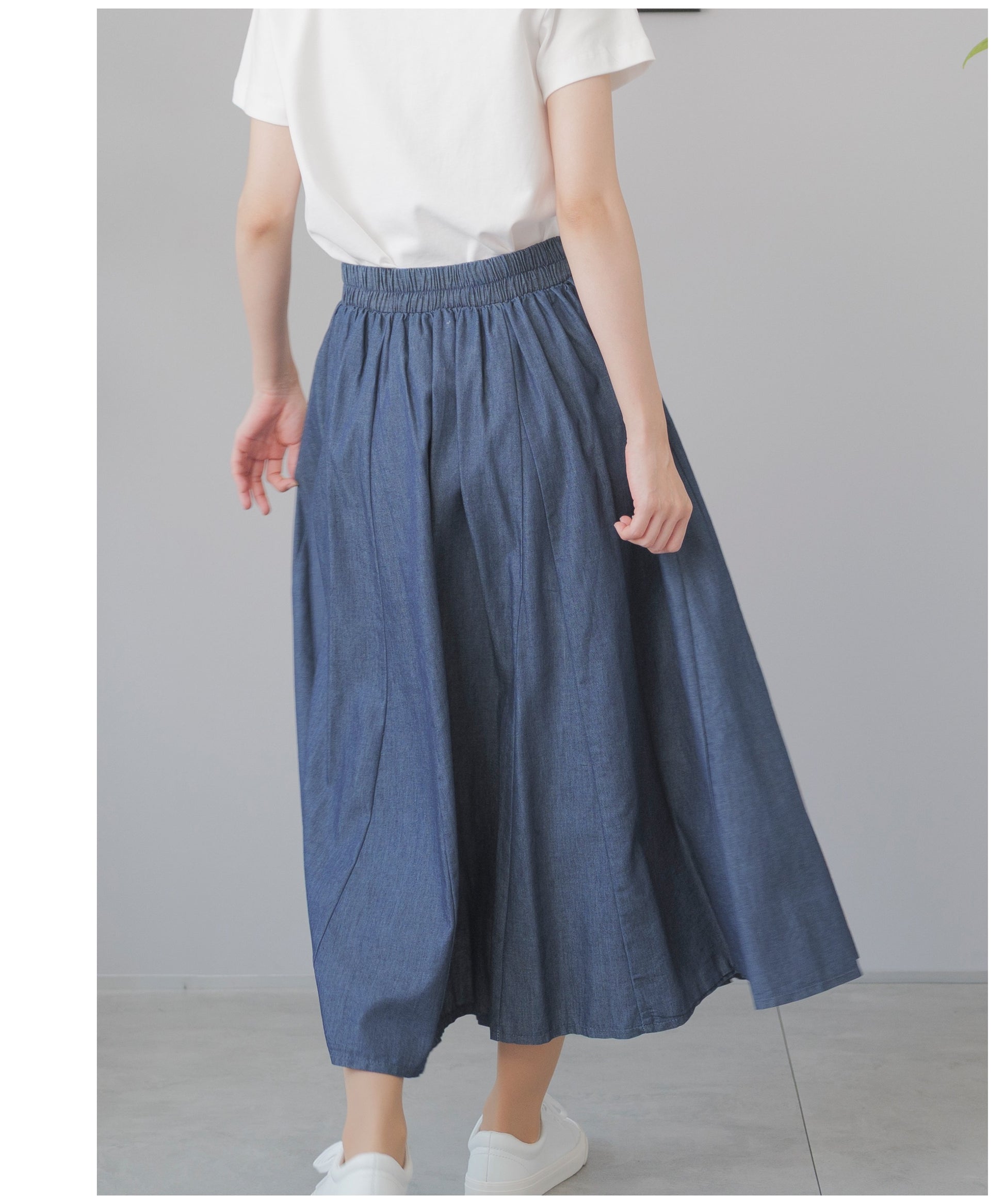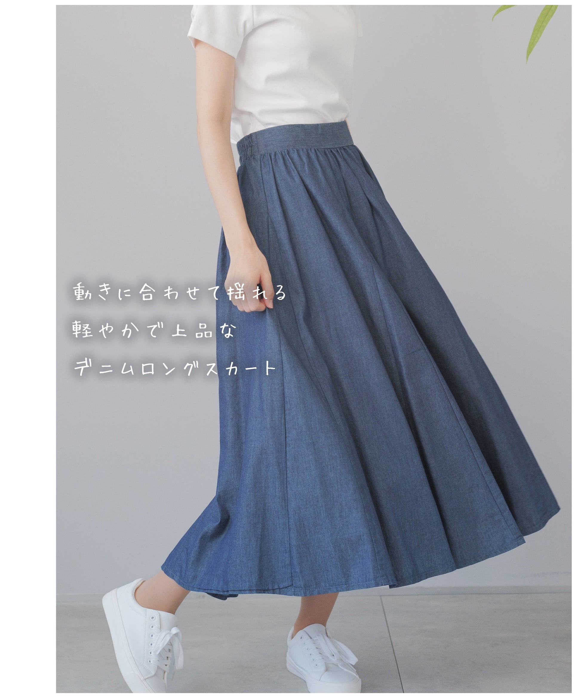 動きに合わせて揺れる、軽やかで上品なデニムサーキュラースカート。広げた時に円形になるのが特徴のサーキュラースカート。フレアの量も多くドレープ感が美しいデザイン。動きに合わせて裾の揺れが軽やかで上品なスカートです。ハリ感のあるコットン100%デニム。柔らかな風合いと軽やかな着心地。重くなりがちなサーキュラースカートでもライトオンスデニムなら軽やかに。すっきりしたフロントデザイン。トップスインもこなせる万能スカート。嬉しい脚長効果も。背面はゴム仕様。ゴムの上からもう一回縫って、もうひと手間。ゴムが中でねじれるのを防いでいます