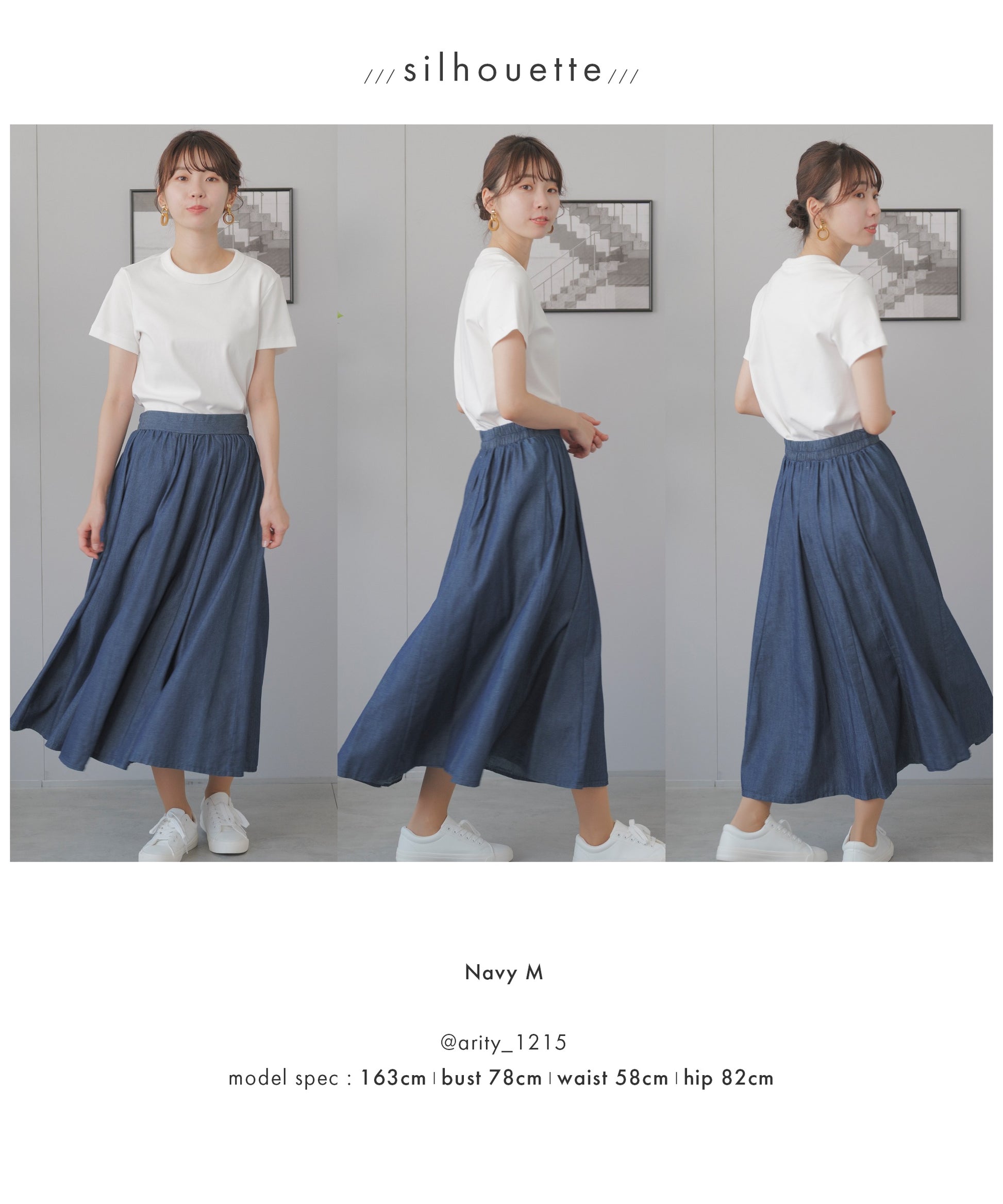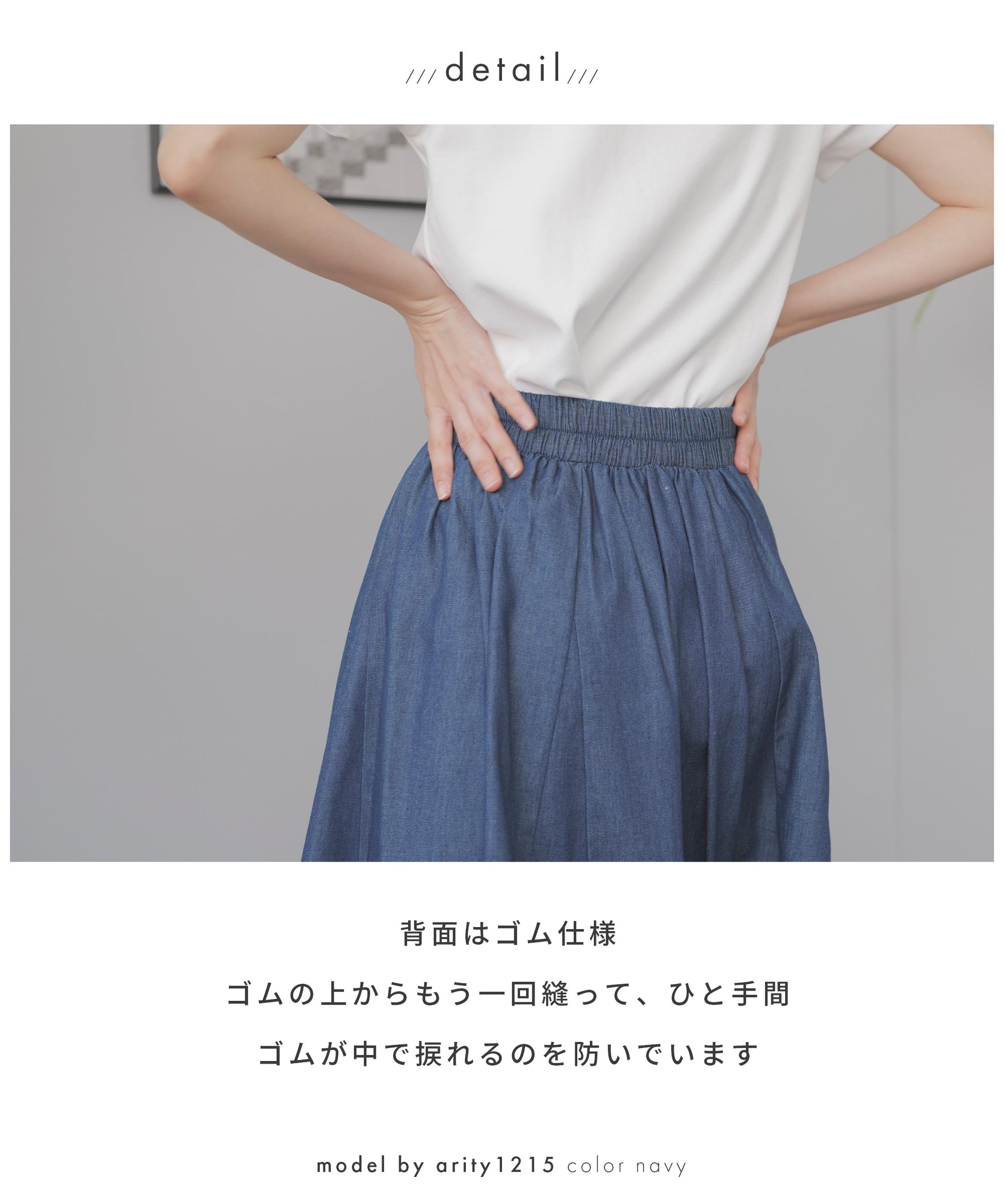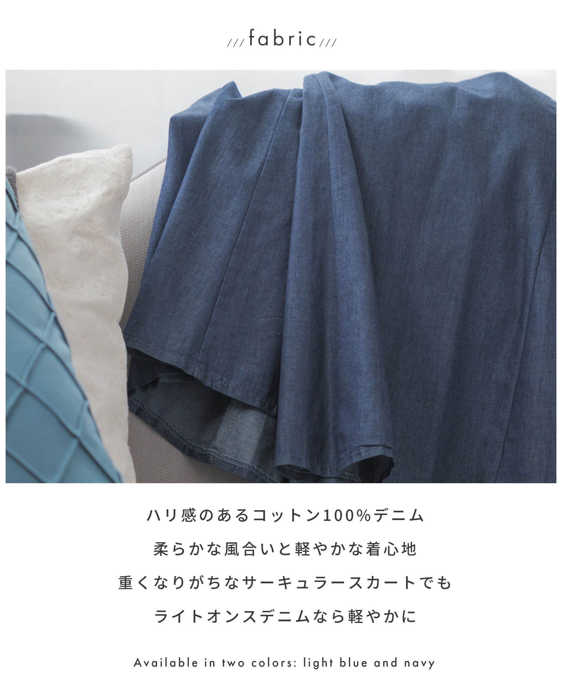 動きに合わせて揺れる、軽やかで上品なデニムサーキュラースカート。広げた時に円形になるのが特徴のサーキュラースカート。フレアの量も多くドレープ感が美しいデザイン。動きに合わせて裾の揺れが軽やかで上品なスカートです。ハリ感のあるコットン100%デニム。柔らかな風合いと軽やかな着心地。重くなりがちなサーキュラースカートでもライトオンスデニムなら軽やかに。すっきりしたフロントデザイン。トップスインもこなせる万能スカート。嬉しい脚長効果も。背面はゴム仕様。ゴムの上からもう一回縫って、もうひと手間。ゴムが中でねじれるのを防いでいます