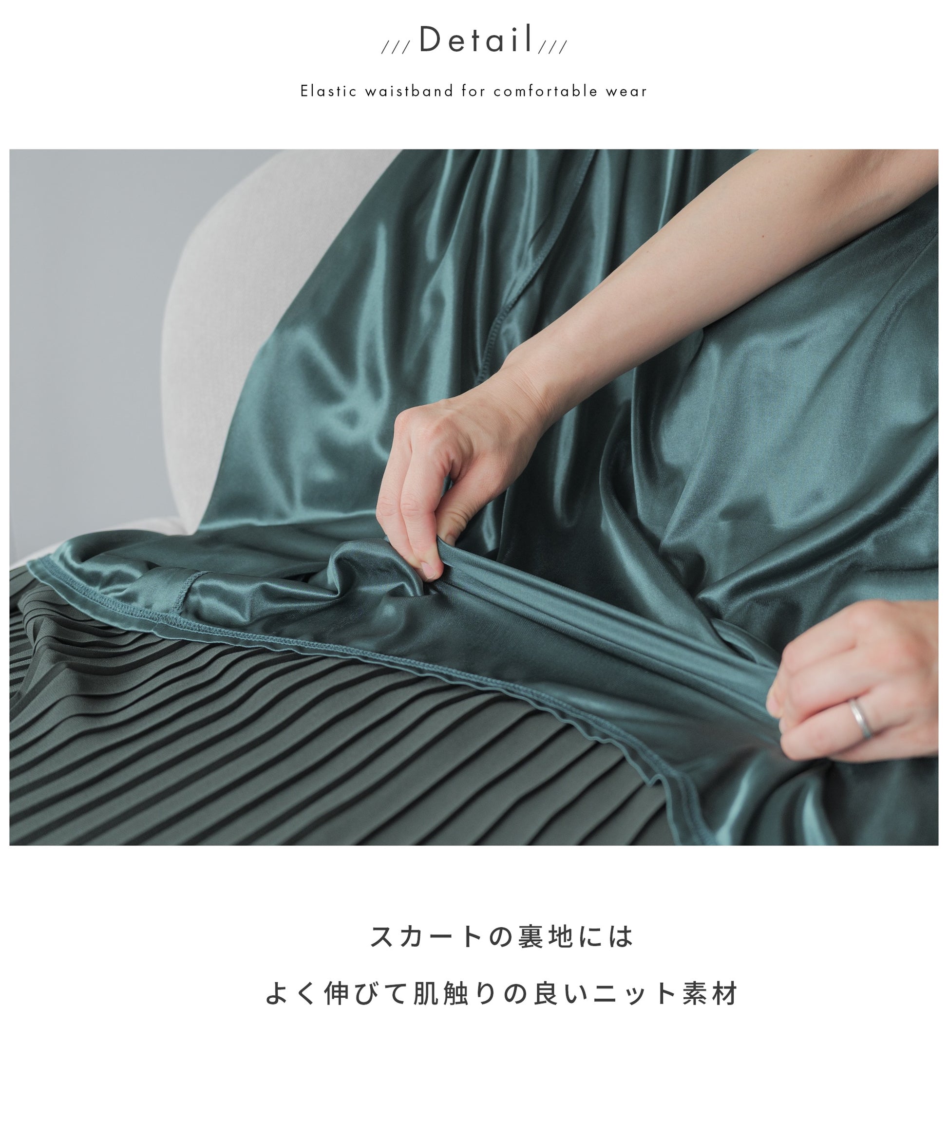 体のラインを拾わず、「ストン」と落ちる細プリーツと広がりがキレイなプリーツの切り替えスカート