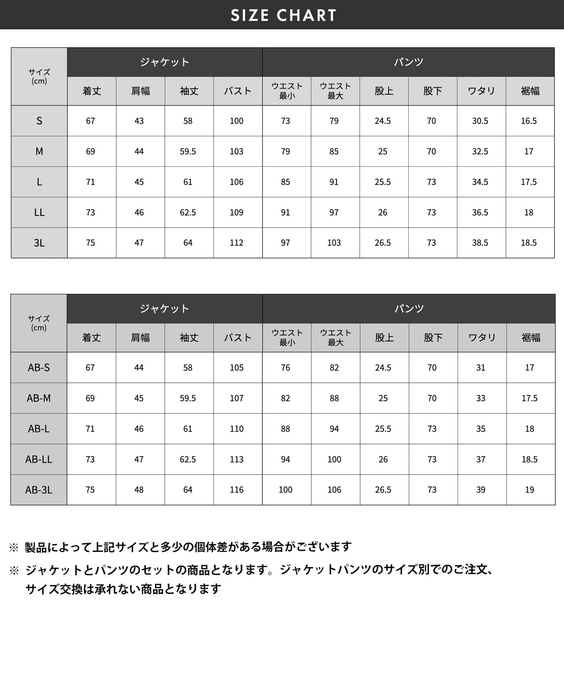 size | S | M | L | LL | 3L | AB-S | AB-M | AB-L | AB-LL | AB-3L |