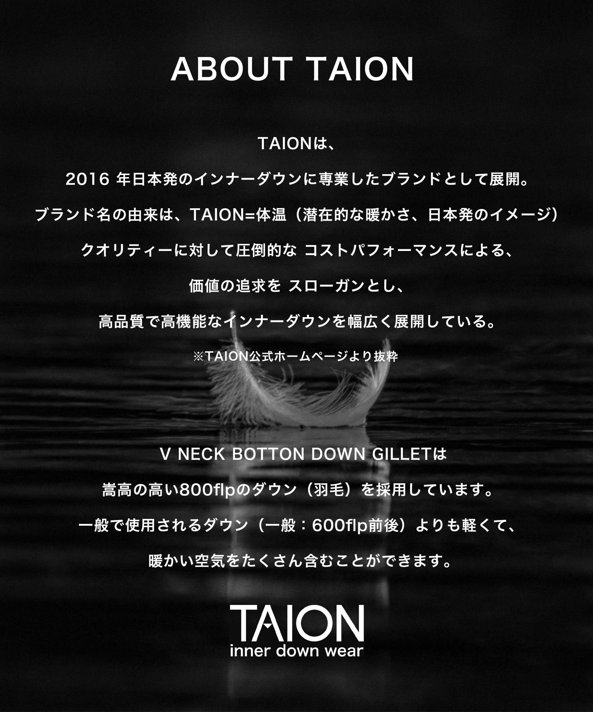 ブランド名の由来は、TAION=体温(潜在的な暖かさ、日本初のイメージ)クオリティーに対して圧倒的なコストパフォーマンスによる、